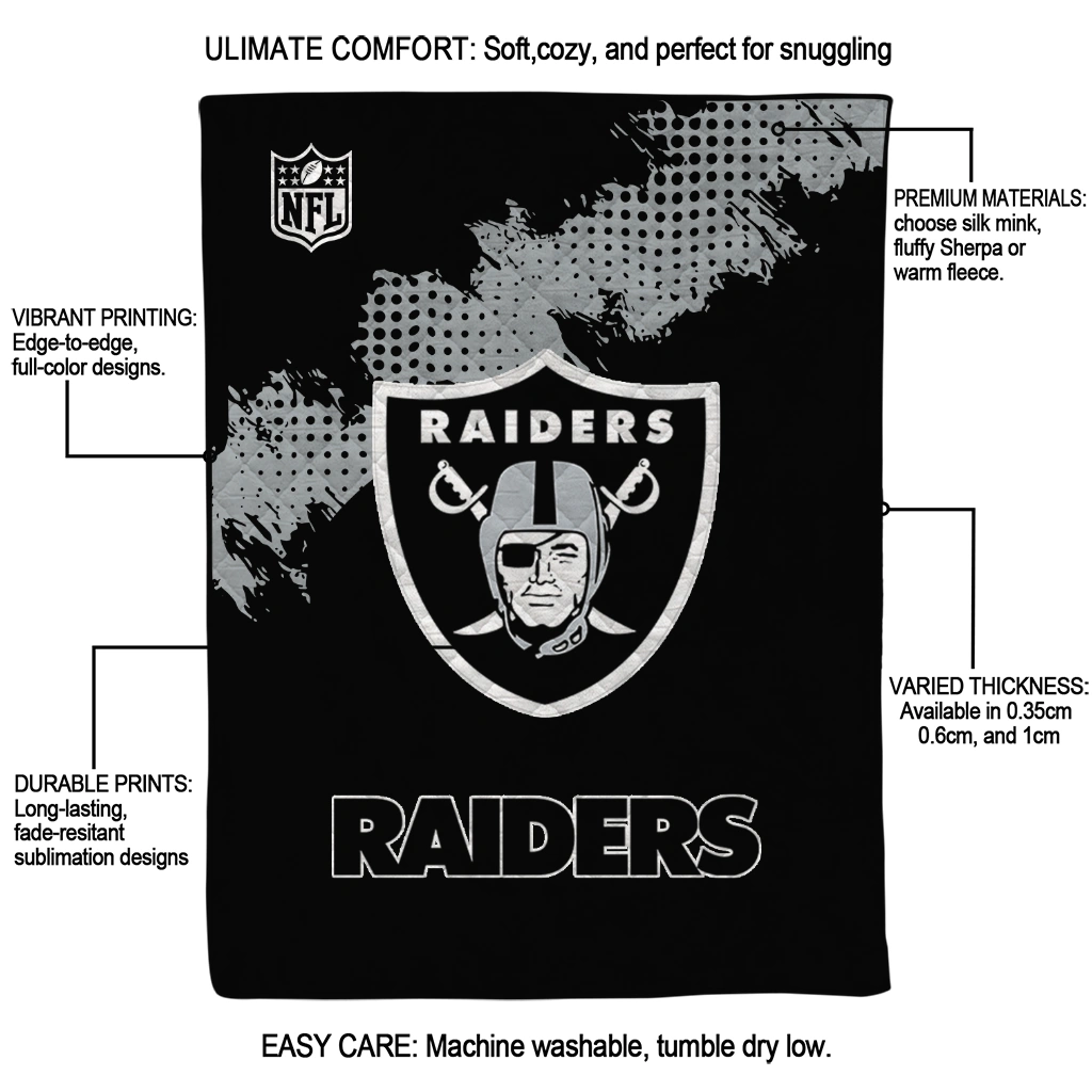 The Las Vegas Raiders Shield Badge Black Quilt Blanket is more than a blanket—it’s everyday comfort, thoughtfully made. Crafted from premium quilting fabric with a soft microfiber touch, it offers a smooth hand-feel and lasting coziness. Layered quilting with a cotton-filled core provides adaptable warmth across seasons while maintaining a clean, tailored look on your bed or sofa.