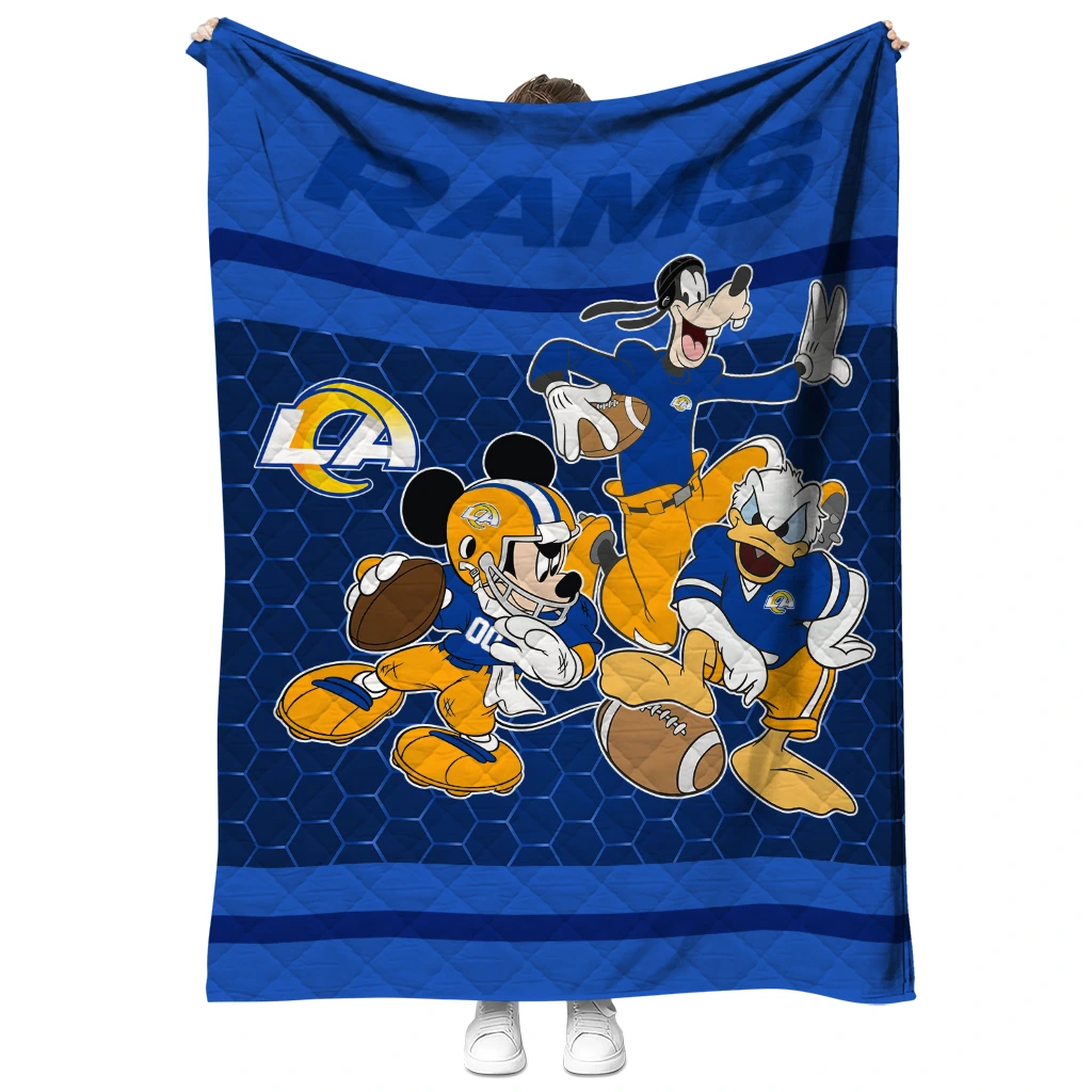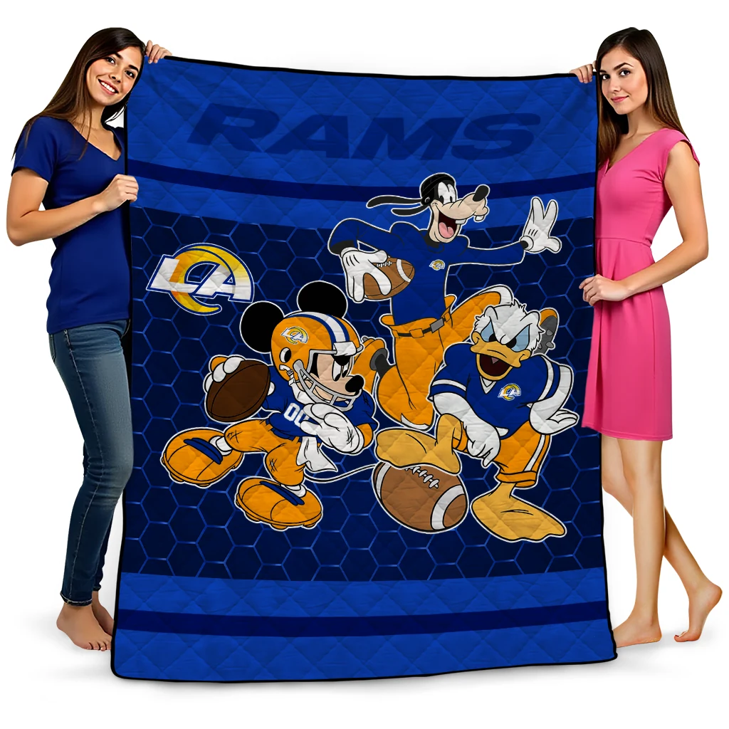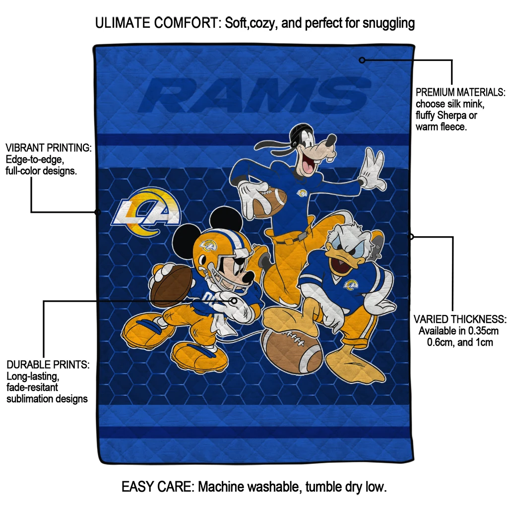Wrap yourself in warmth and pride with the Los Angeles Rams Disney Football Blue Quilt Blanket from the Los Angeles Rams Blankets collection at Yes That Blanket. Made from 100% premium quilting-weight polyester blended with a touch of microfiber, this quilt offers a smooth, soft finish you’ll love. Choose between two quilting styles—Stipple or Diagonal—and enjoy the comfort of a cotton-filled layer inside that adds extra coziness for every season. The border is available in classic black or white, giving your design a clean, timeless edge.