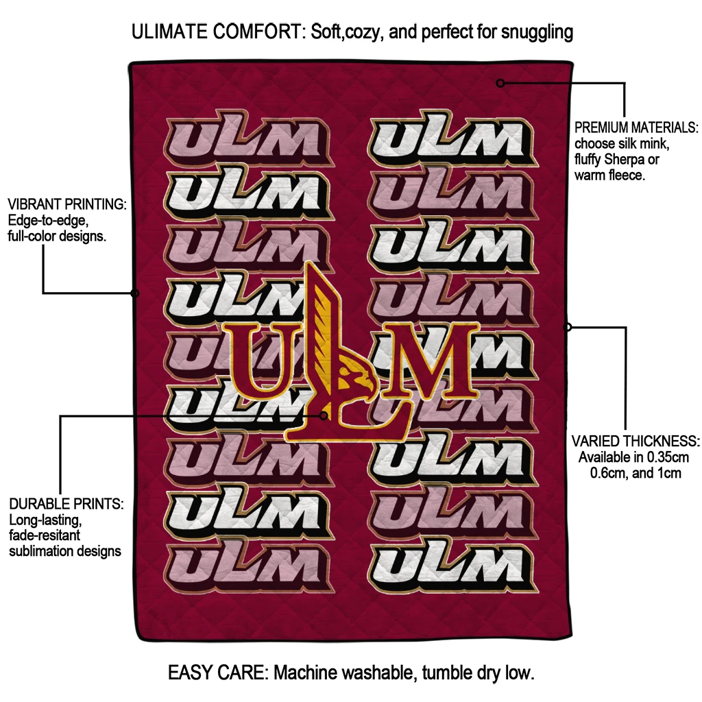 Wrap yourself in warmth and pride with the Louisiana-Monroe Warhawks Bold Red Quilt Blanket from the Louisiana-Monroe Warhawks Blankets collection at Yes That Blanket. Made from 100% premium quilting-weight polyester blended with a touch of microfiber, this quilt offers a smooth, soft finish you’ll love. Choose between two quilting styles—Stipple or Diagonal—and enjoy the comfort of a cotton-filled layer inside that adds extra coziness for every season. The border is available in classic black or white, giving your design a clean, timeless edge.