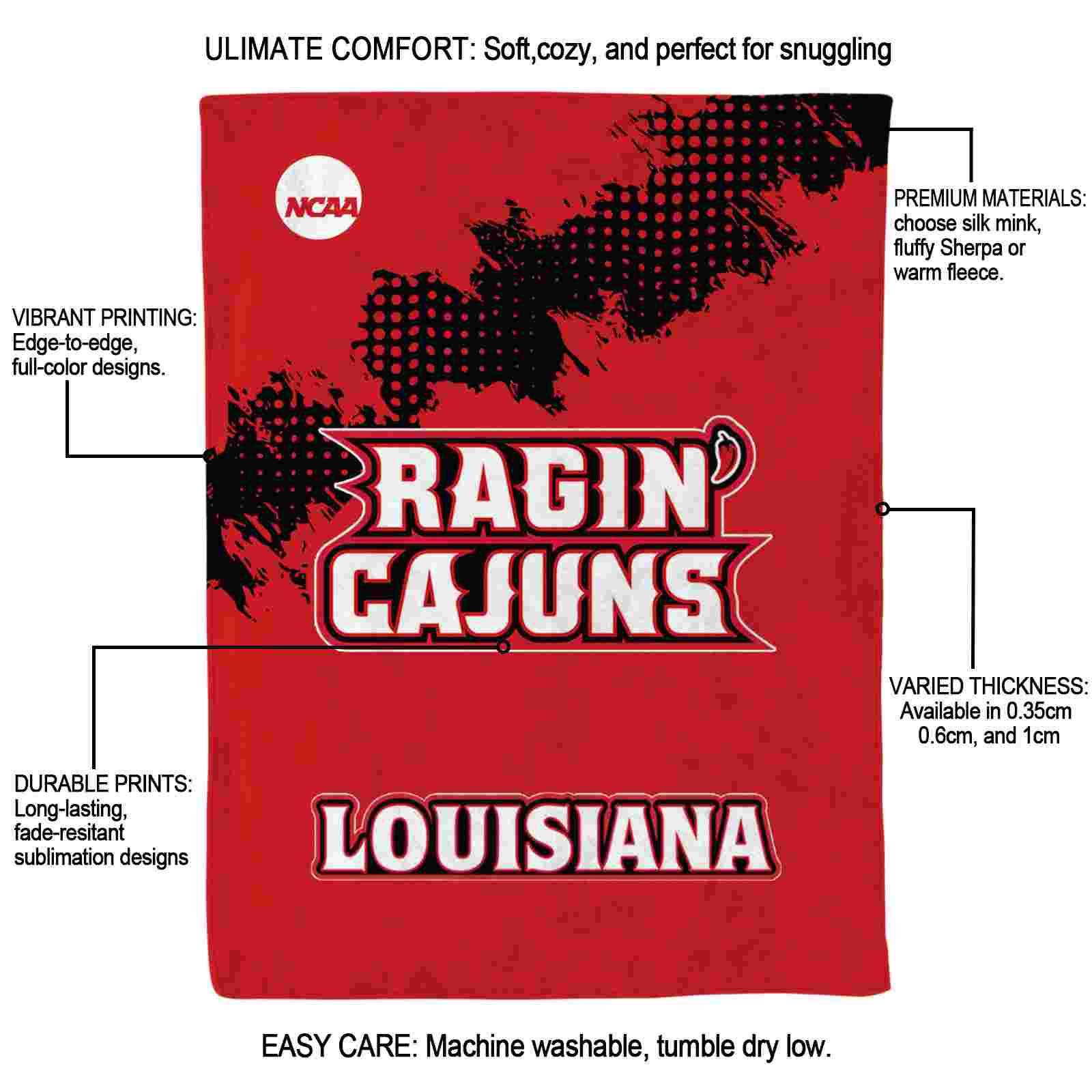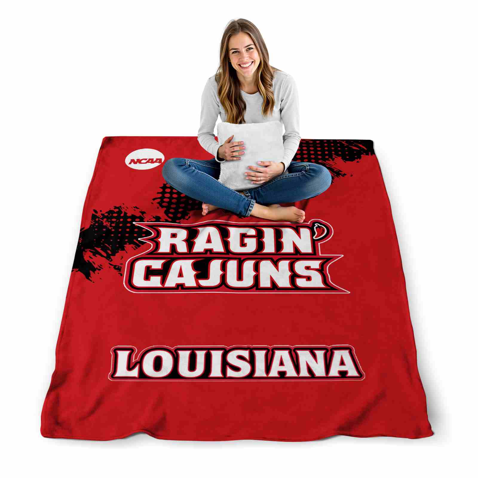 Without a doubt, the Louisiana Ragin’ Cajuns Grunge Texture Red Blanket from Louisiana Ragin’ Cajuns Blankets collection is offering true fans a chance to showcase passion in a cool way. Personalize it with your favorite team’s logo or a meaningful name to make it uniquely yours. Isn’t that great? The full-color print ensures vibrant, edge-to-edge designs, bringing your sports enthusiasm to life!