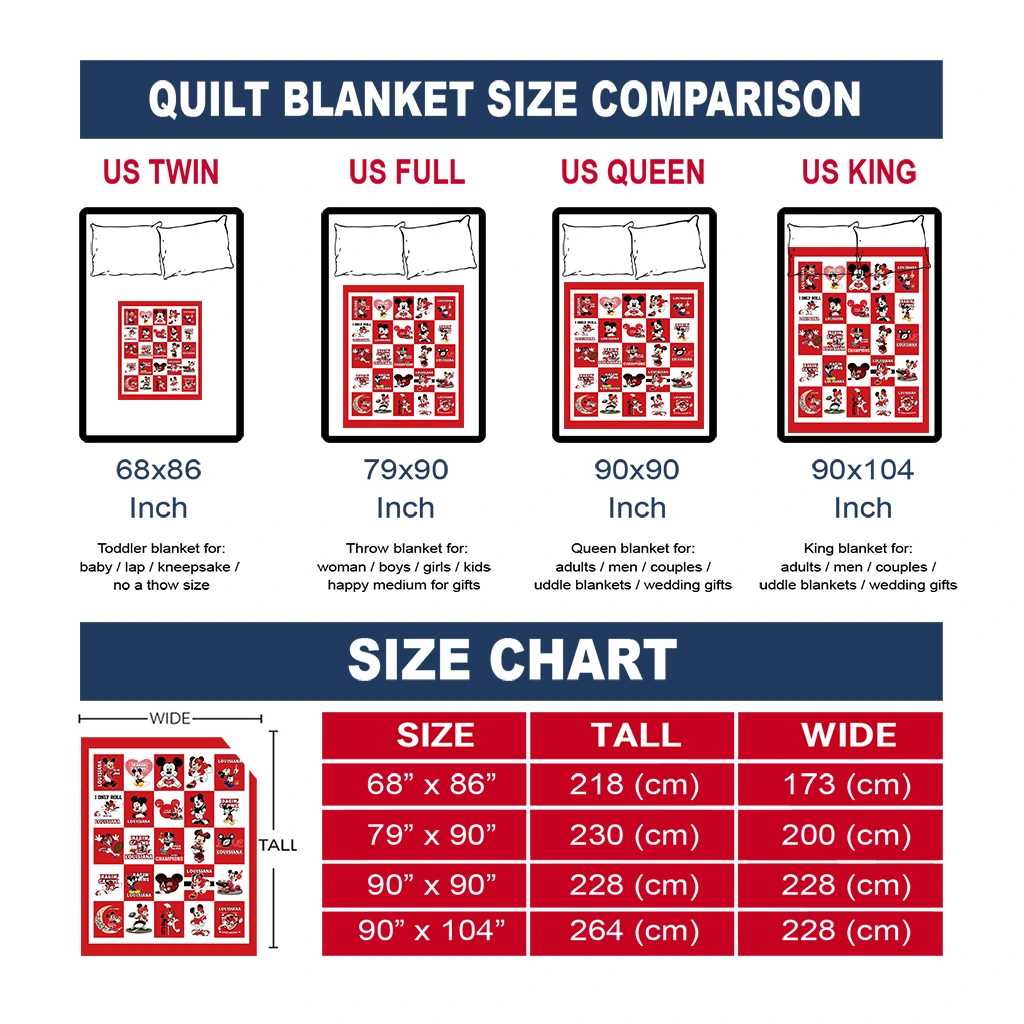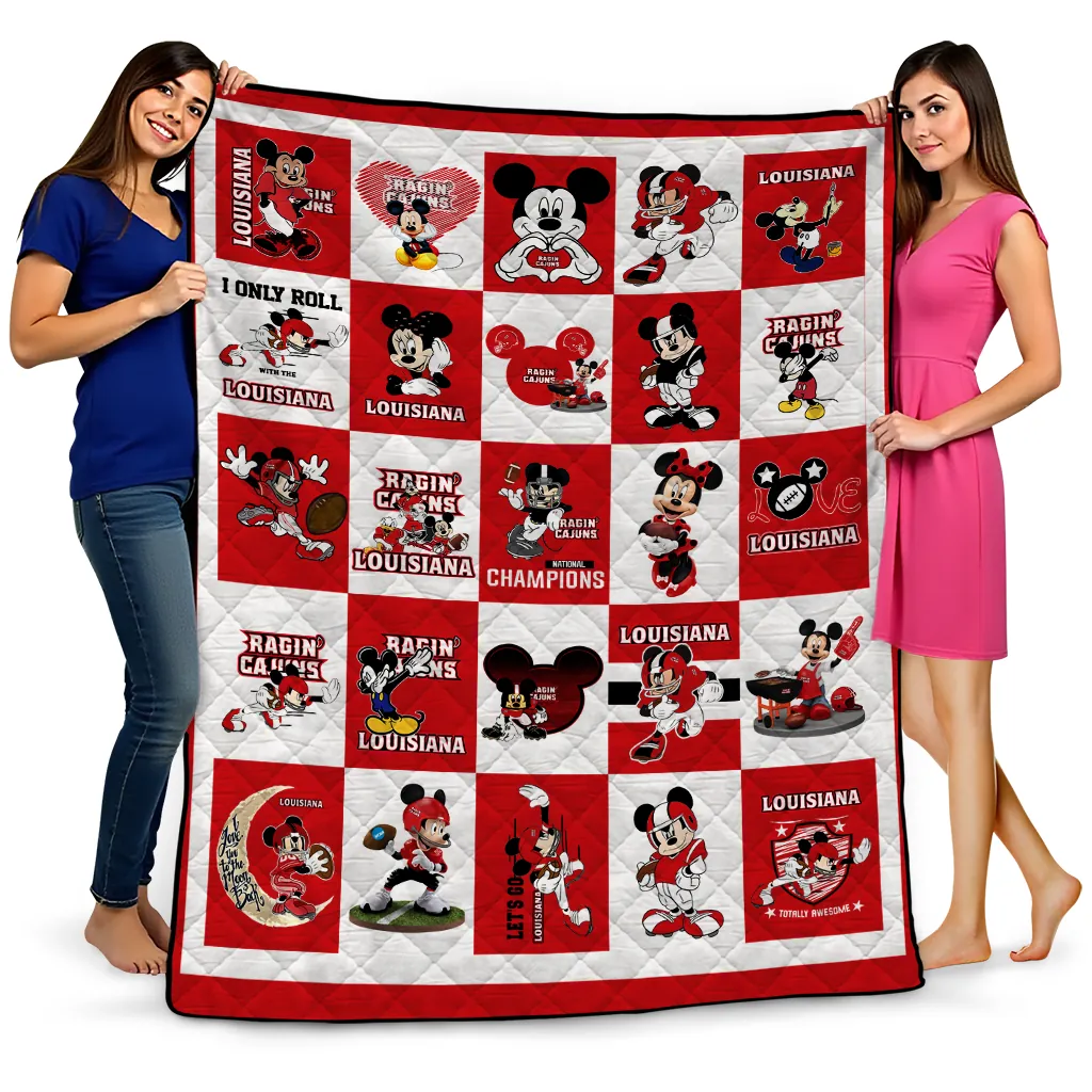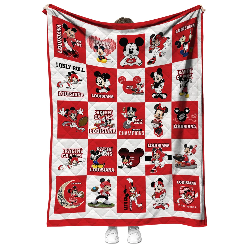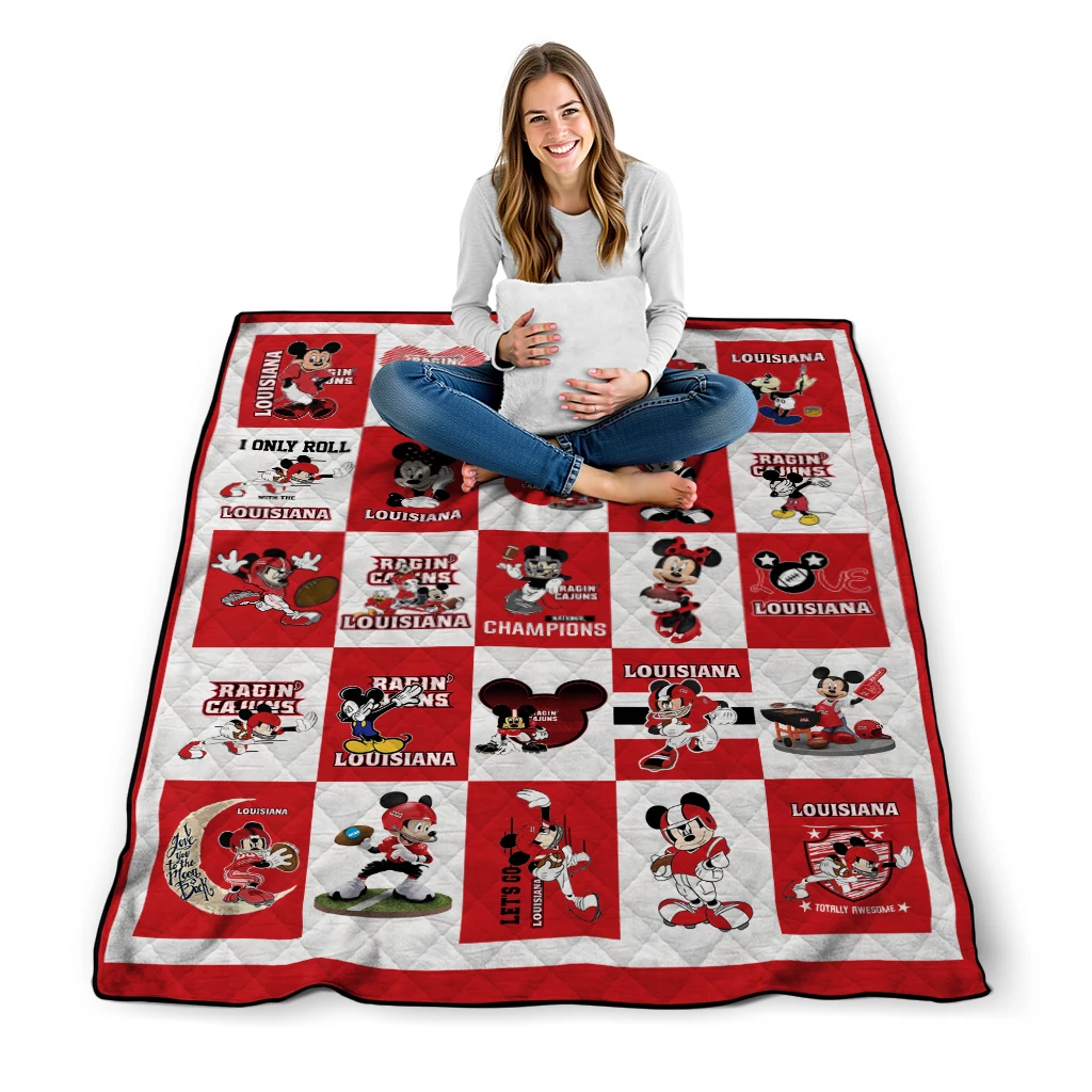 The Louisiana Ragin' Cajuns Mickey Mouse Motif Red White Quilt Blanket is more than a blanket—it’s everyday comfort, thoughtfully made. Crafted from premium quilting fabric with a soft microfiber touch, it offers a smooth hand-feel and lasting coziness. Layered quilting with a cotton-filled core provides adaptable warmth across seasons while maintaining a clean, tailored look on your bed or sofa.