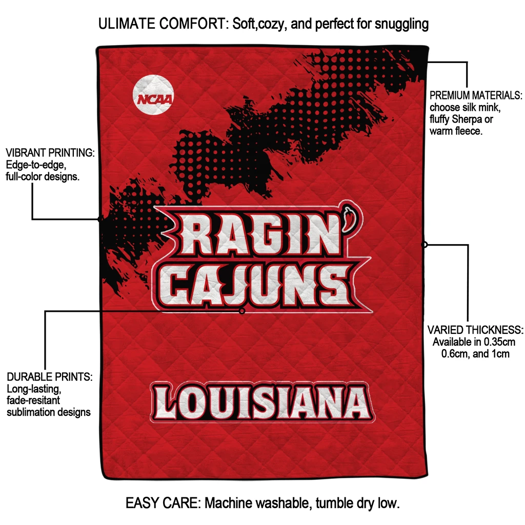 Wrap yourself in warmth and pride with the Louisiana Ragin' Cajuns Paint Trail Red Quilt Blanket from the Louisiana Ragin' Cajuns Blankets collection at Yes That Blanket. Made from 100% premium quilting-weight polyester blended with a touch of microfiber, this quilt offers a smooth, soft finish you’ll love. Choose between two quilting styles—Stipple or Diagonal—and enjoy the comfort of a cotton-filled layer inside that adds extra coziness for every season. The border is available in classic black or white, giving your design a clean, timeless edge.