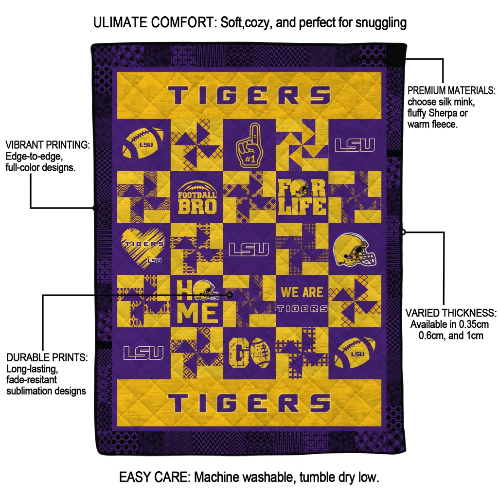The LSU Tigers Helmet Heart Purple Quilt Blanket is more than a blanket—it’s everyday comfort, thoughtfully made. Crafted from premium quilting fabric with a soft microfiber touch, it offers a smooth hand-feel and lasting coziness. Layered quilting with a cotton-filled core provides adaptable warmth across seasons while maintaining a clean, tailored look on your bed or sofa.