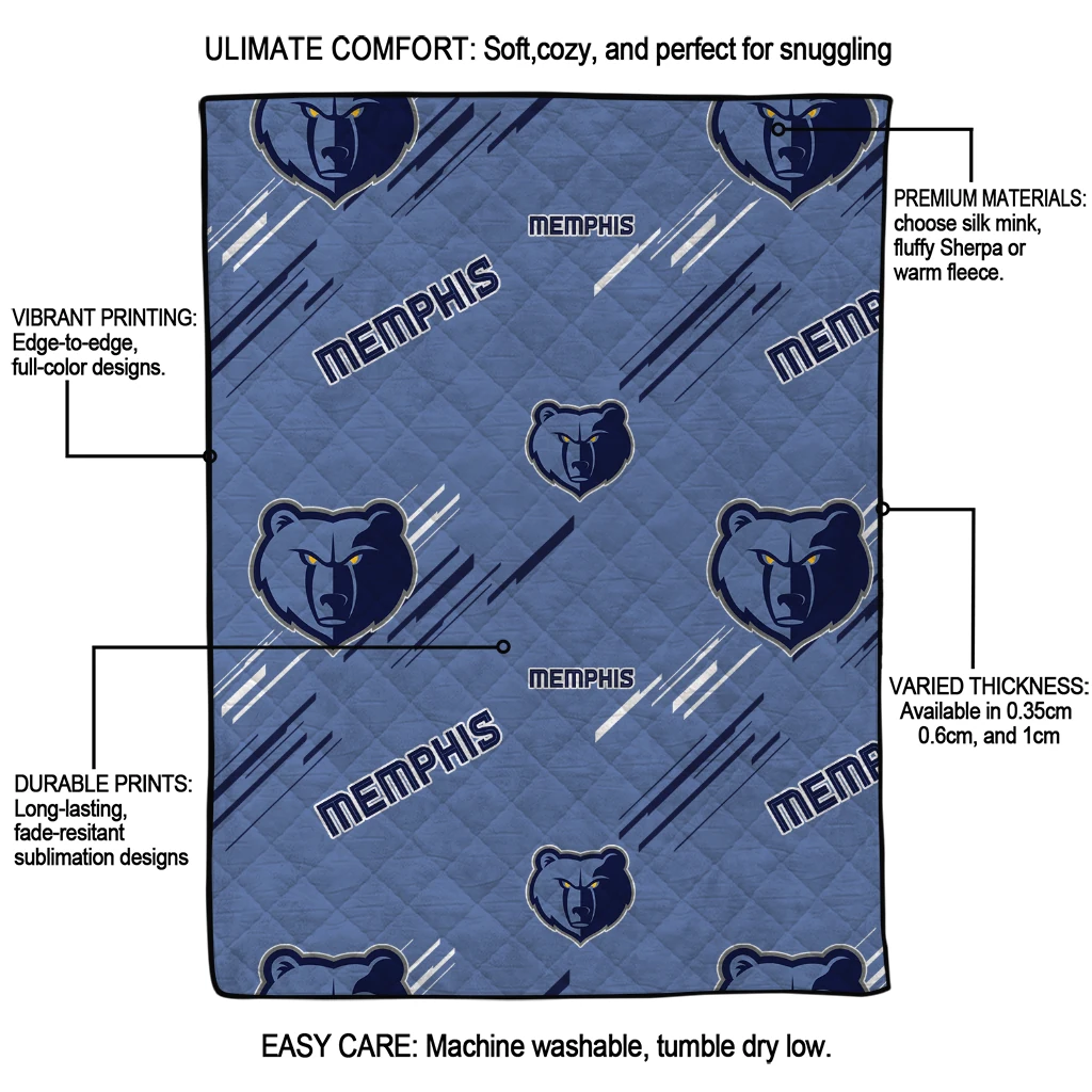 Wrap yourself in warmth and pride with the Memphis Grizzlies Sketch Lines Blue Quilt Blanket from the Memphis Grizzlies Blankets collection at Yes That Blanket. Made from 100% premium quilting-weight polyester blended with a touch of microfiber, this quilt offers a smooth, soft finish you’ll love. Choose between two quilting styles—Stipple or Diagonal—and enjoy the comfort of a cotton-filled layer inside that adds extra coziness for every season. The border is available in classic black or white, giving your design a clean, timeless edge.