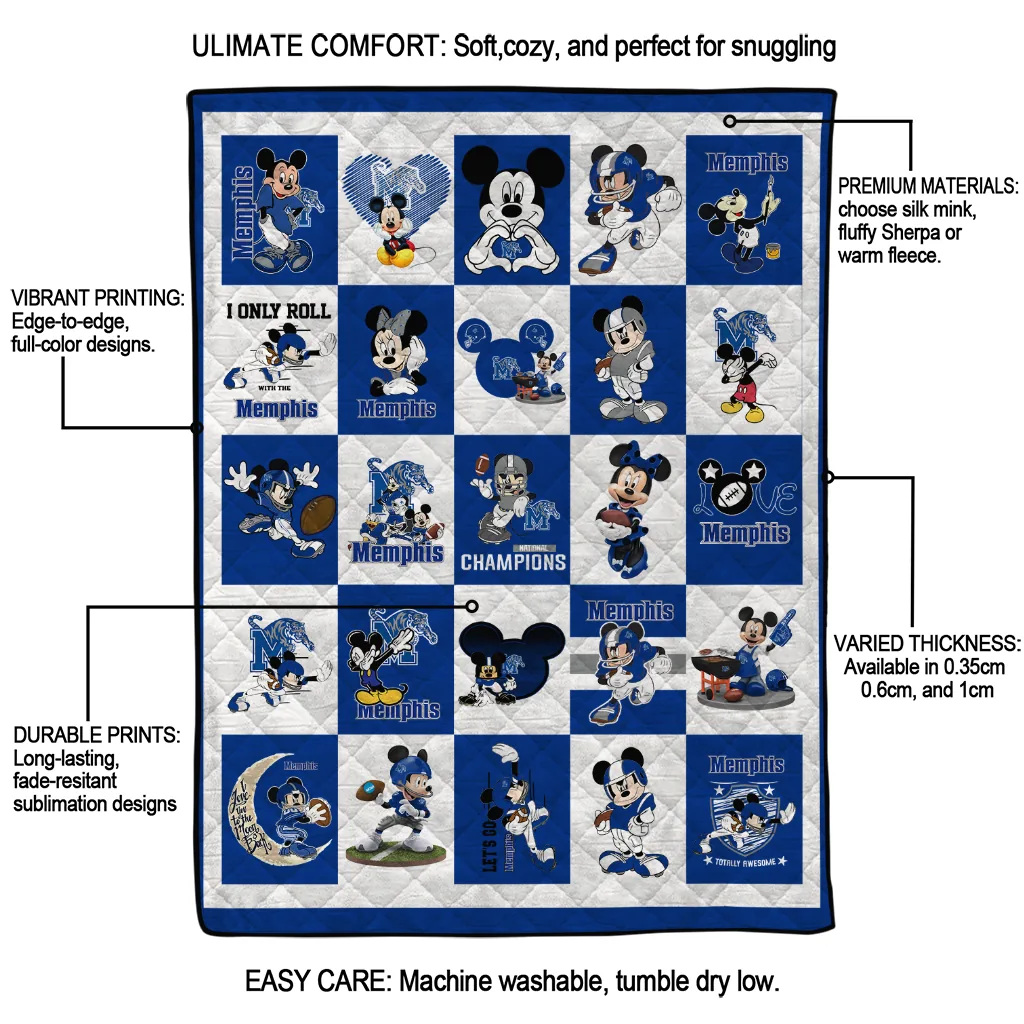 The Memphis Tigers Mickey Mouse Motif Blue White Quilt Blanket is more than a blanket—it’s everyday comfort, thoughtfully made. Crafted from premium quilting fabric with a soft microfiber touch, it offers a smooth hand-feel and lasting coziness. Layered quilting with a cotton-filled core provides adaptable warmth across seasons while maintaining a clean, tailored look on your bed or sofa.