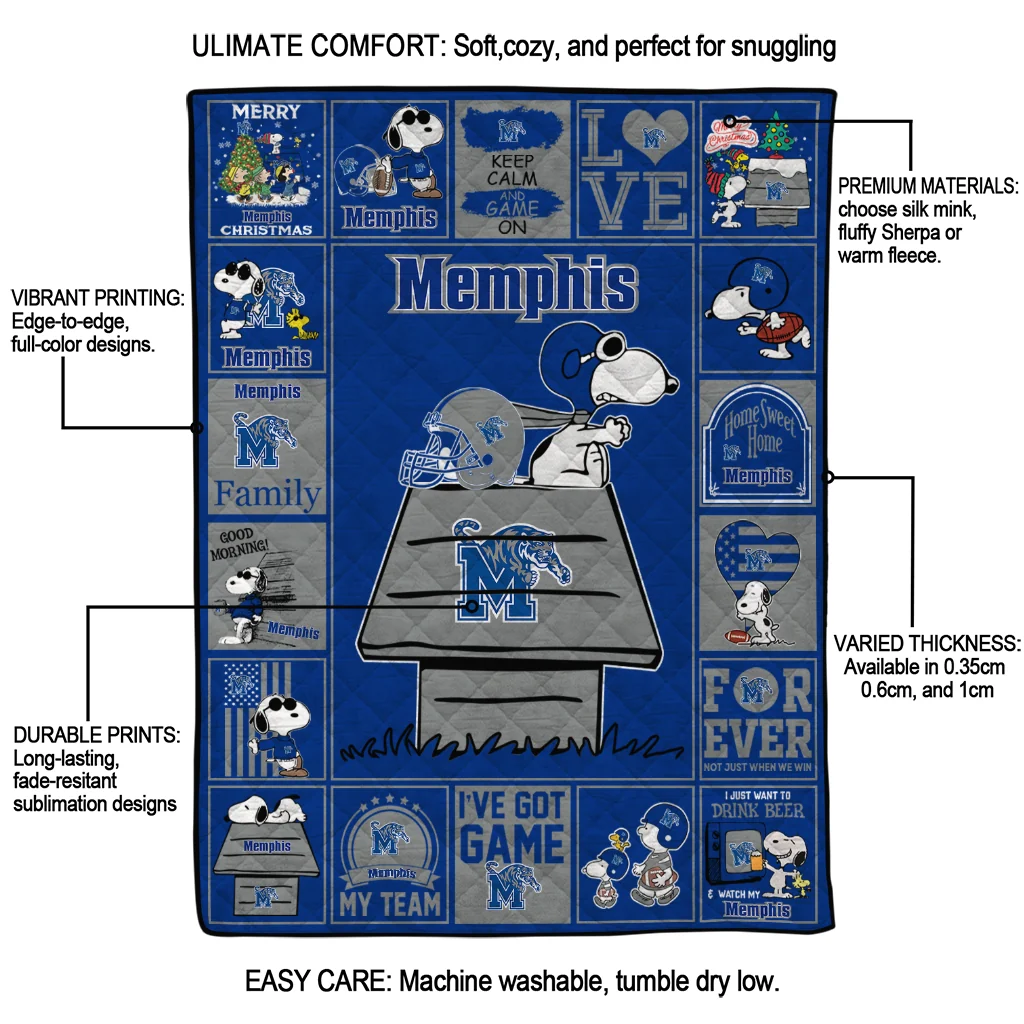 The Memphis Tigers Snoopy Love Blue Quilt Blanket is more than a blanket—it’s everyday comfort, thoughtfully made. Crafted from premium quilting fabric with a soft microfiber touch, it offers a smooth hand-feel and lasting coziness. Layered quilting with a cotton-filled core provides adaptable warmth across seasons while maintaining a clean, tailored look on your bed or sofa.