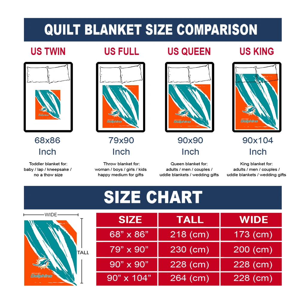 The Miami Dolphins Stroke Art Aqua White Quilt Blanket is more than a blanket—it’s everyday comfort, thoughtfully made. Crafted from premium quilting fabric with a soft microfiber touch, it offers a smooth hand-feel and lasting coziness. Layered quilting with a cotton-filled core provides adaptable warmth across seasons while maintaining a clean, tailored look on your bed or sofa.
