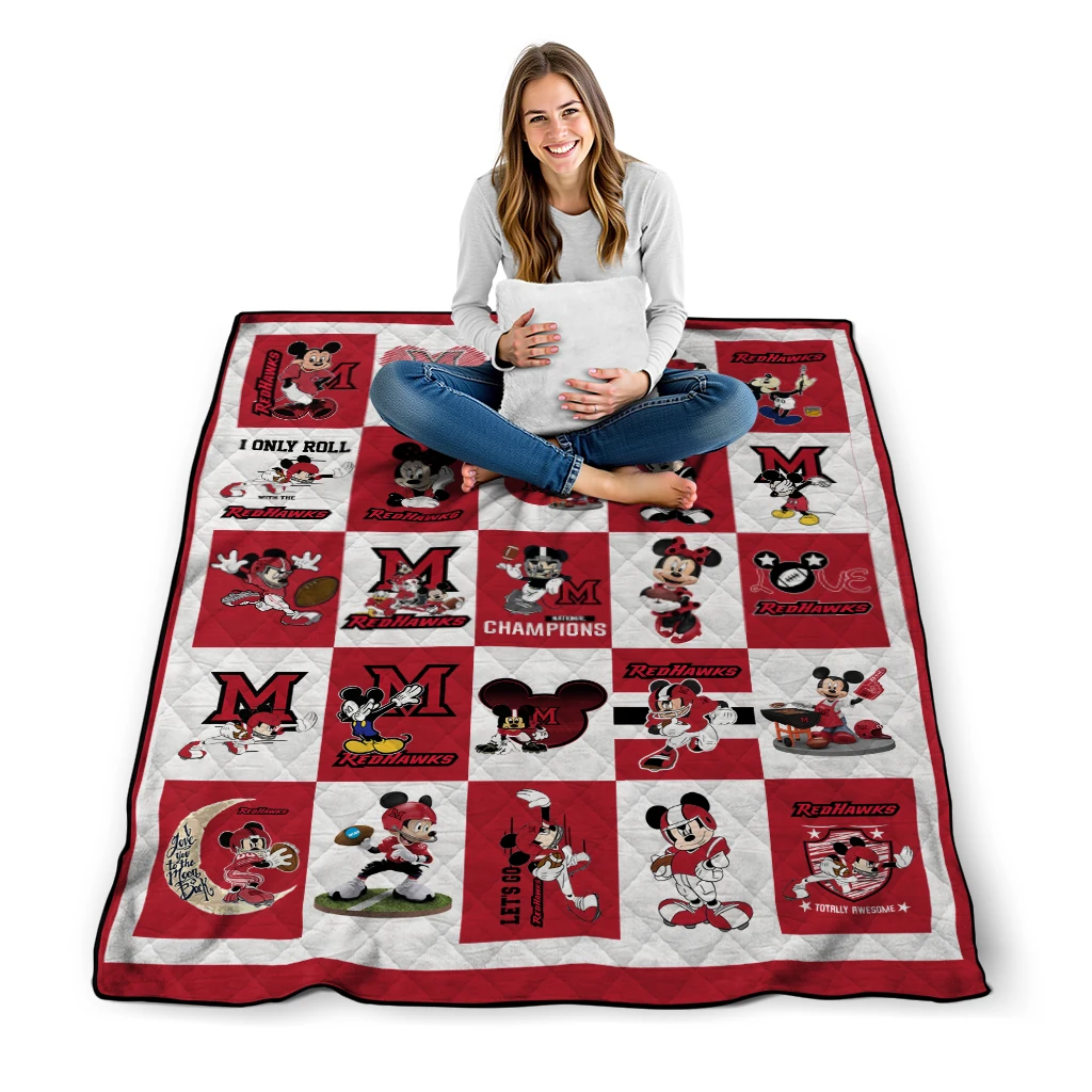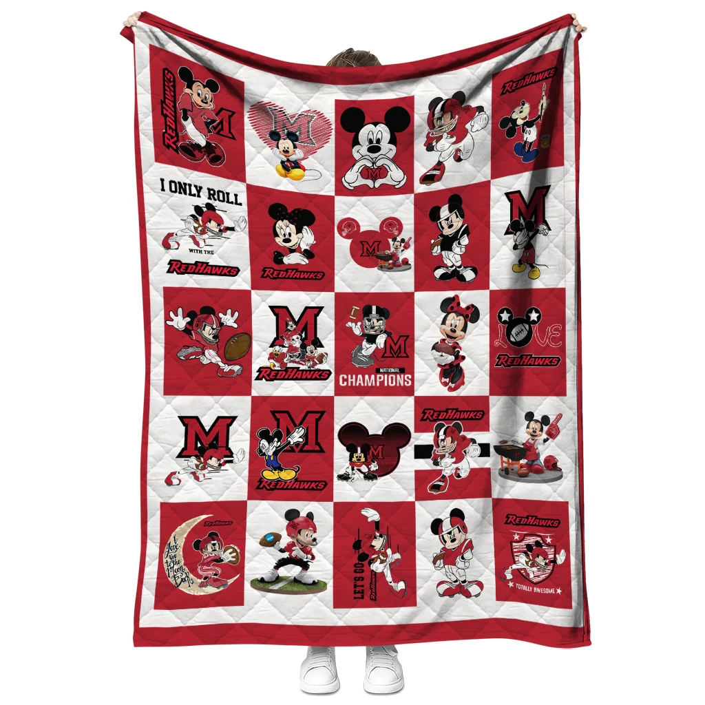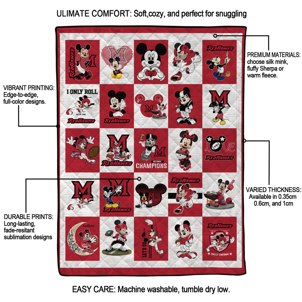 Wrap yourself in warmth and pride with the Miami RedHawks Mickey Mouse Motif Red White Quilt Blanket from the Miami RedHawks Blankets collection at Yes That Blanket. Made from 100% premium quilting-weight polyester blended with a touch of microfiber, this quilt offers a smooth, soft finish you’ll love. Choose between two quilting styles—Stipple or Diagonal—and enjoy the comfort of a cotton-filled layer inside that adds extra coziness for every season. The border is available in classic black or white, giving your design a clean, timeless edge.