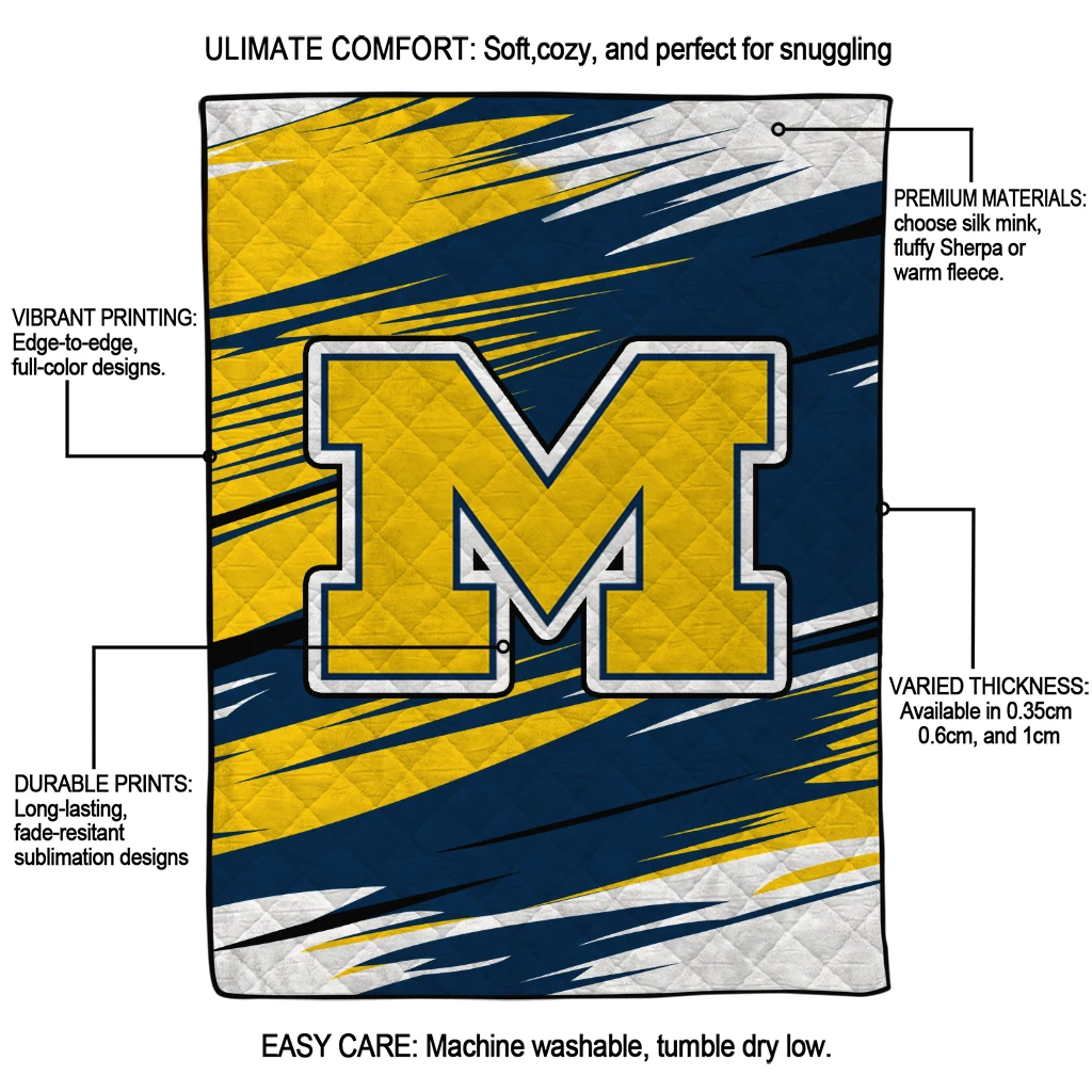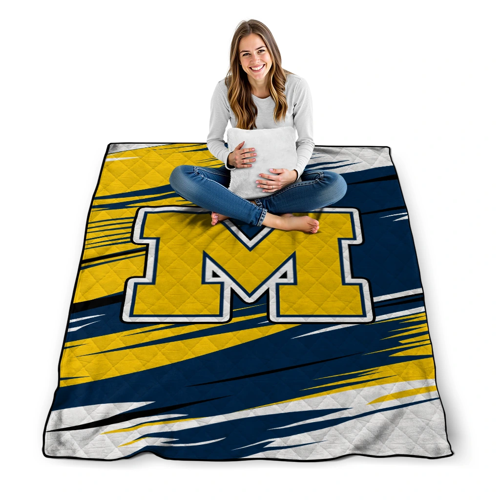 The Michigan Wolverines Wild Lines Blue White Quilt Blanket is more than a blanket—it’s everyday comfort, thoughtfully made. Crafted from premium quilting fabric with a soft microfiber touch, it offers a smooth hand-feel and lasting coziness. Layered quilting with a cotton-filled core provides adaptable warmth across seasons while maintaining a clean, tailored look on your bed or sofa.