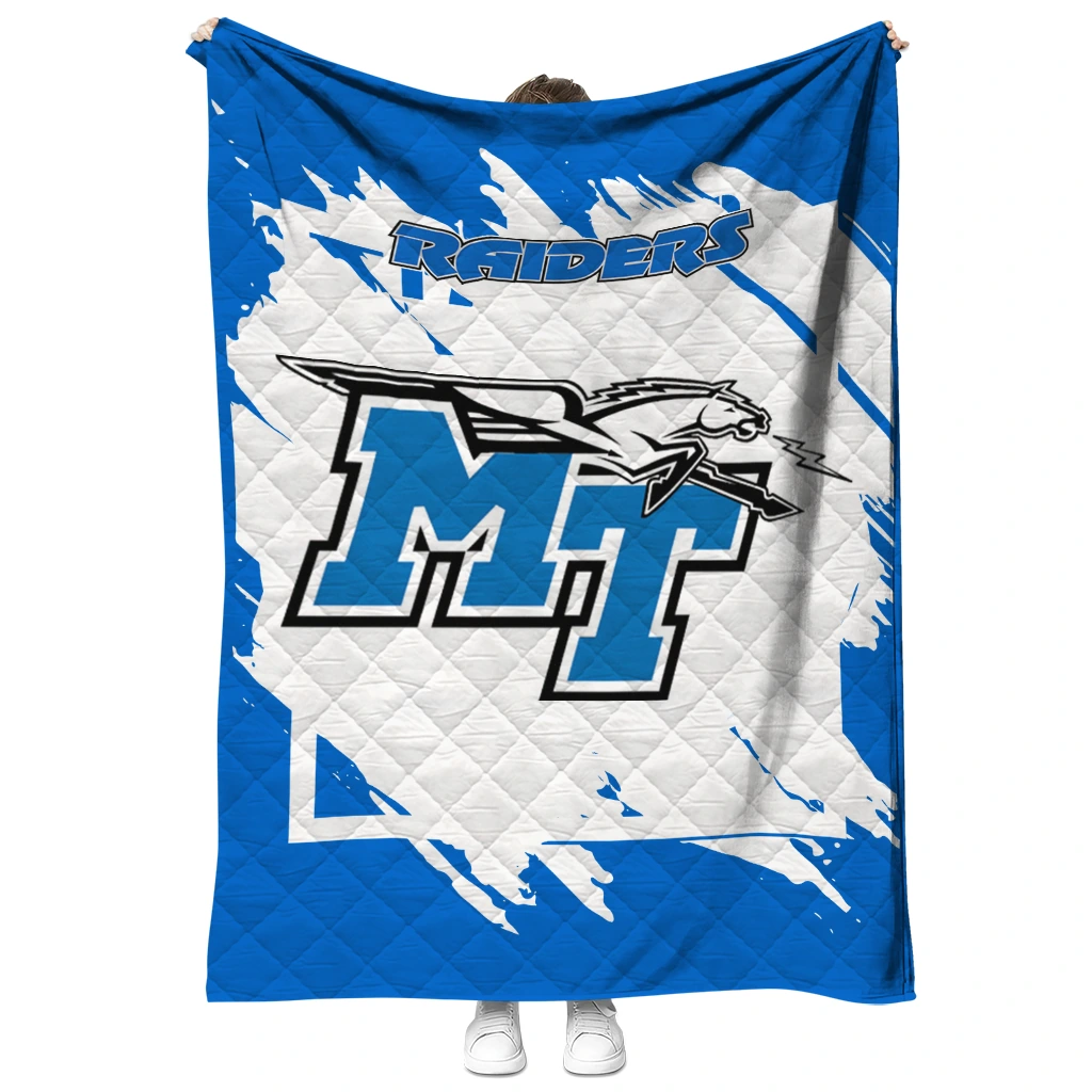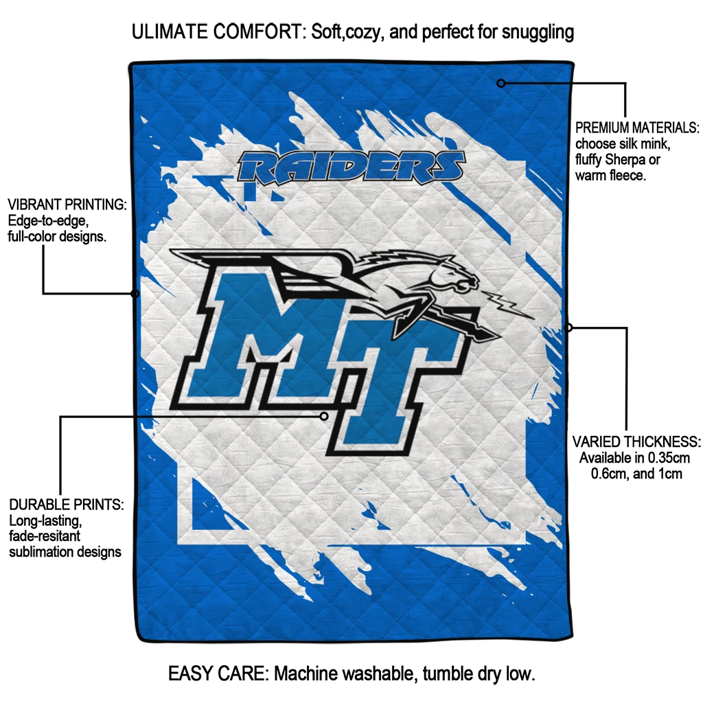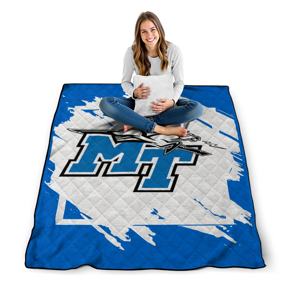 Wrap yourself in warmth and pride with the Middle Tennessee Blue Raiders Block Border Blue Quilt Blanket from the Middle Tennessee Blue Raiders Blankets collection at Yes That Blanket. Made from 100% premium quilting-weight polyester blended with a touch of microfiber, this quilt offers a smooth, soft finish you’ll love. Choose between two quilting styles—Stipple or Diagonal—and enjoy the comfort of a cotton-filled layer inside that adds extra coziness for every season. The border is available in classic black or white, giving your design a clean, timeless edge.