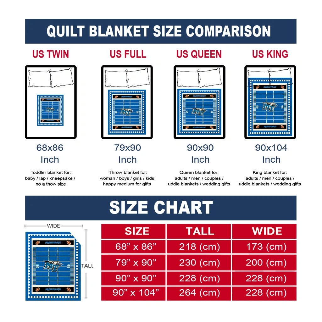 Wrap yourself in warmth and pride with the Middle Tennessee Blue Raiders Mickey Player Blue Quilt Blanket from the Middle Tennessee Blue Raiders Blankets collection at Yes That Blanket. Made from 100% premium quilting-weight polyester blended with a touch of microfiber, this quilt offers a smooth, soft finish you’ll love. Choose between two quilting styles—Stipple or Diagonal—and enjoy the comfort of a cotton-filled layer inside that adds extra coziness for every season. The border is available in classic black or white, giving your design a clean, timeless edge.