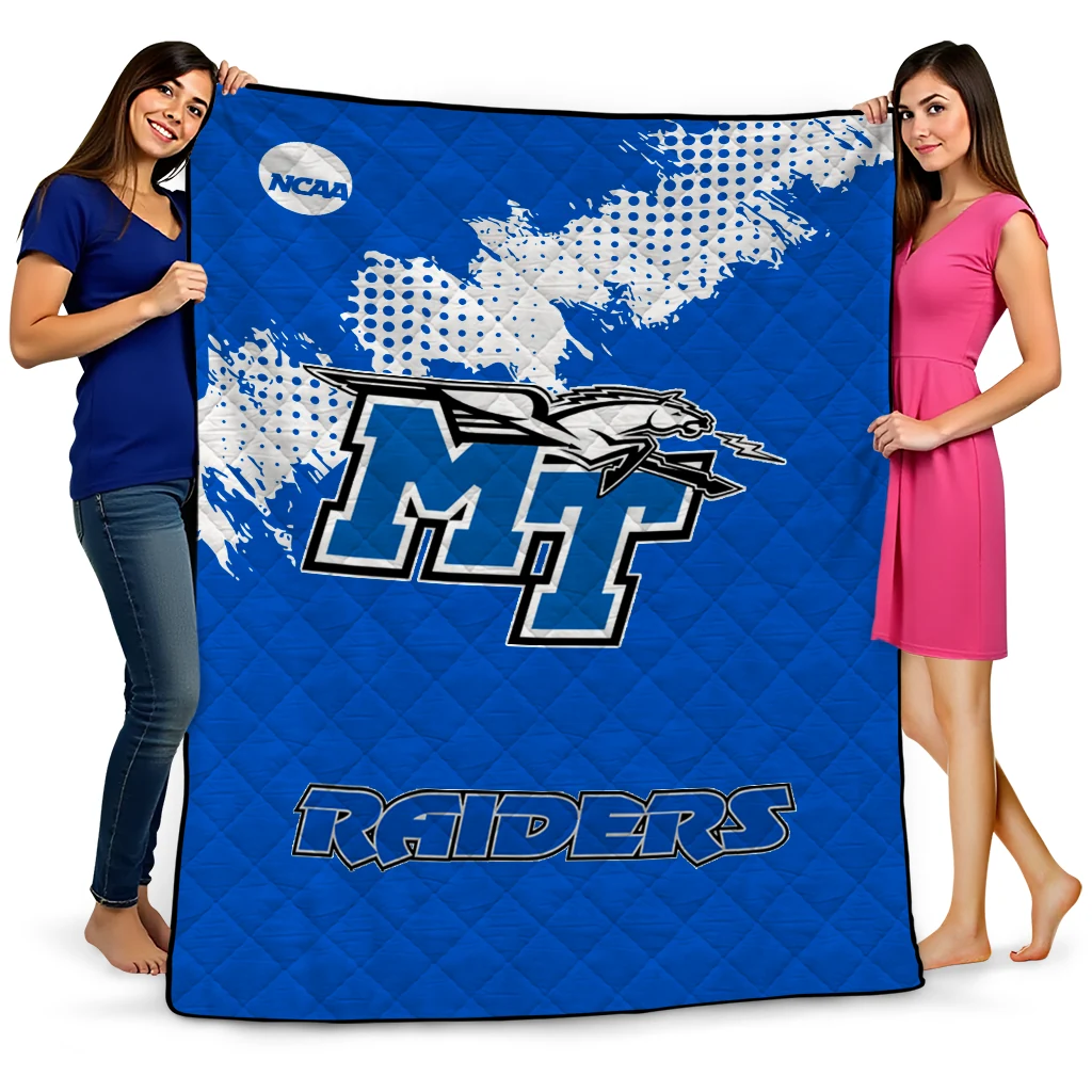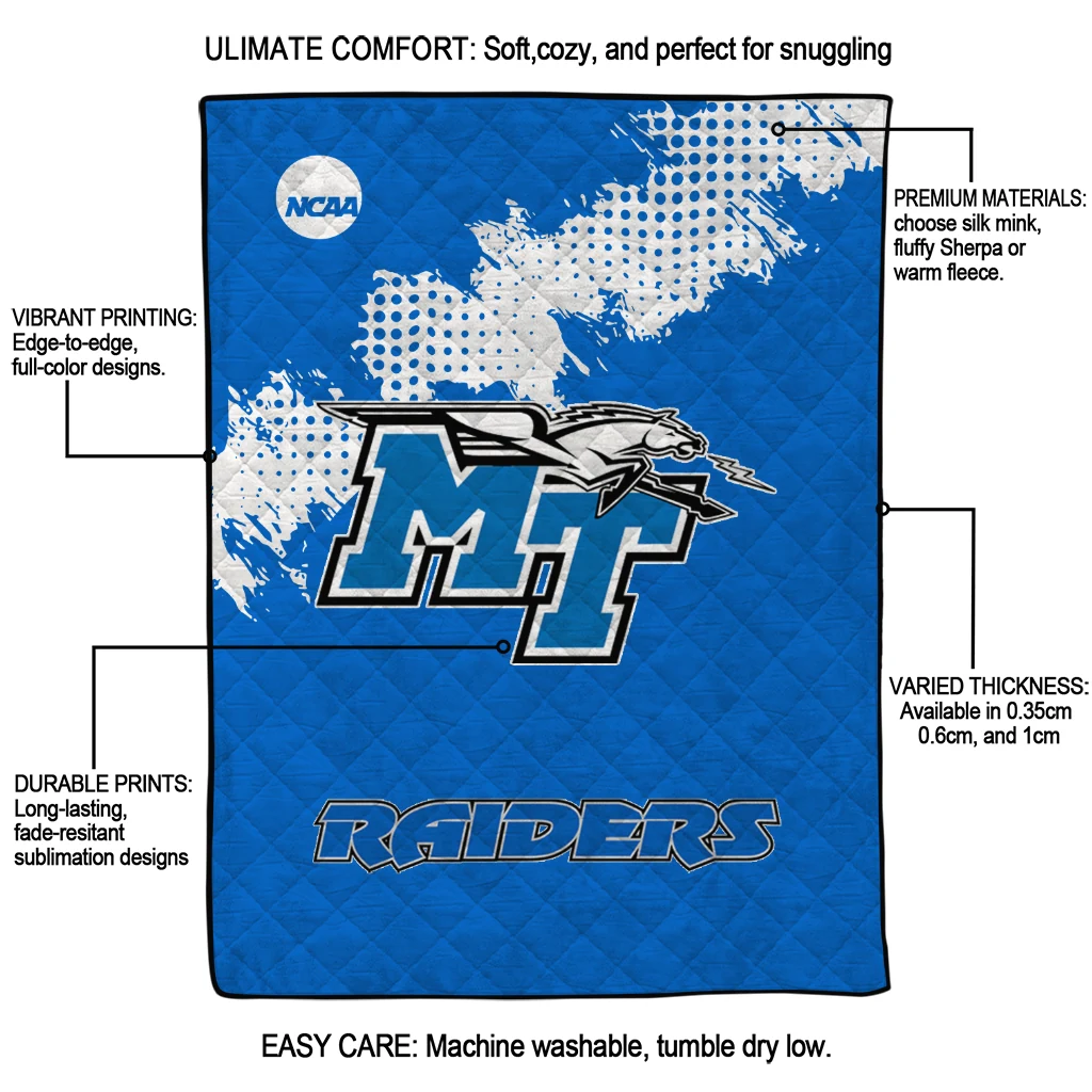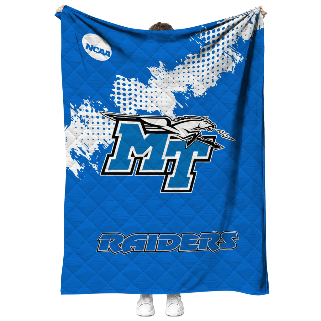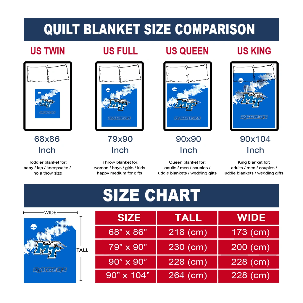 Wrap yourself in warmth and pride with the Middle Tennessee Blue Raiders Paint Trail Blue Quilt Blanket from the Middle Tennessee Blue Raiders Blankets collection at Yes That Blanket. Made from 100% premium quilting-weight polyester blended with a touch of microfiber, this quilt offers a smooth, soft finish you’ll love. Choose between two quilting styles—Stipple or Diagonal—and enjoy the comfort of a cotton-filled layer inside that adds extra coziness for every season. The border is available in classic black or white, giving your design a clean, timeless edge.