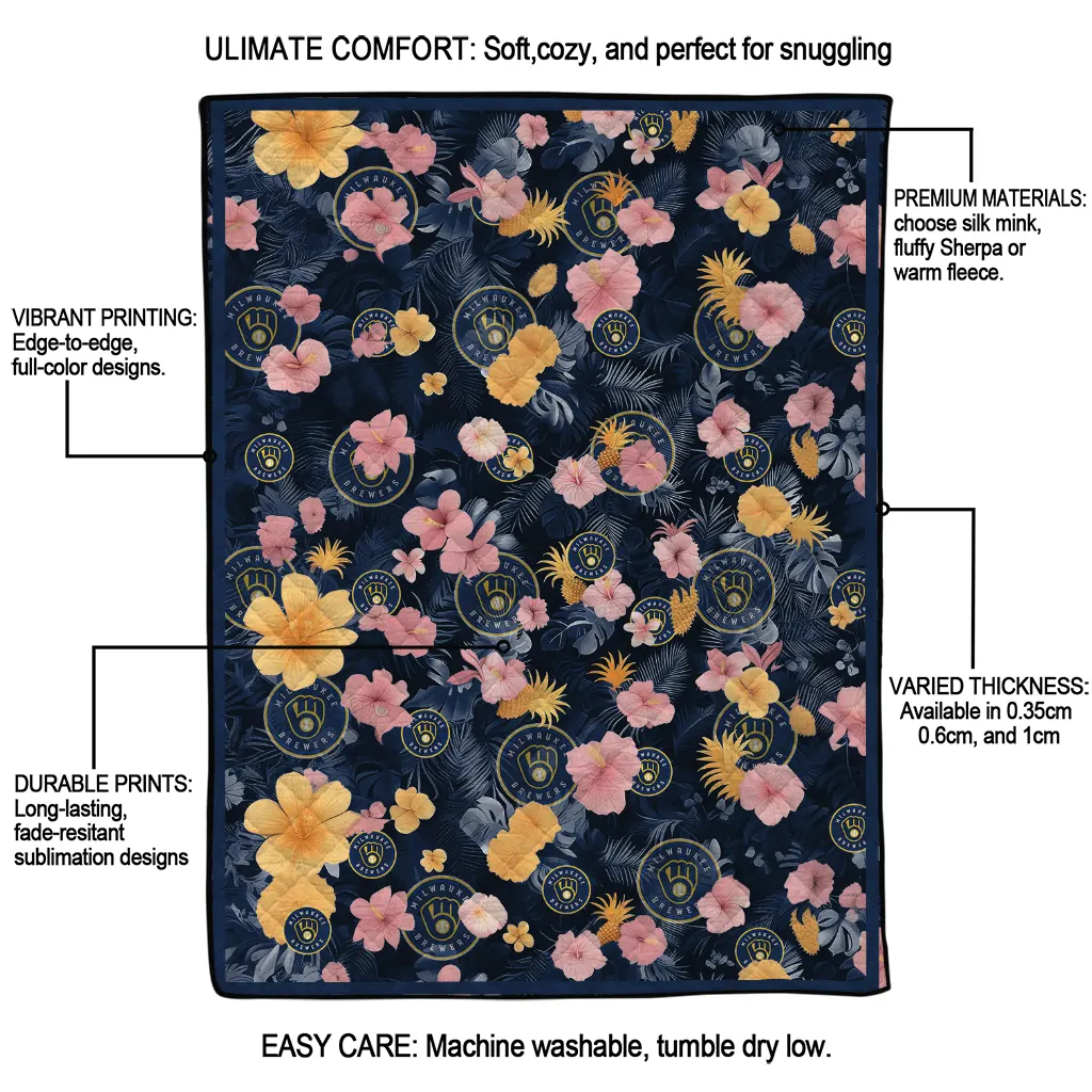 Wrap yourself in warmth and pride with the Milwaukee Brewers Hibiscus Foliage Navy Blue Quilt Blanket from the Milwaukee Brewers Blankets collection at Yes That Blanket. Made from 100% premium quilting-weight polyester blended with a touch of microfiber, this quilt offers a smooth, soft finish you’ll love. Choose between two quilting styles—Stipple or Diagonal—and enjoy the comfort of a cotton-filled layer inside that adds extra coziness for every season. The border is available in classic black or white, giving your design a clean, timeless edge.