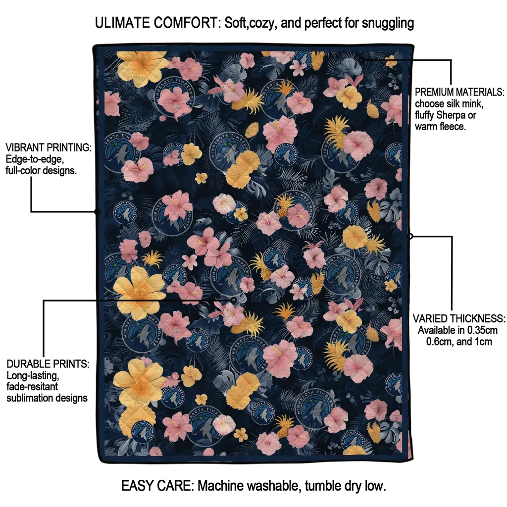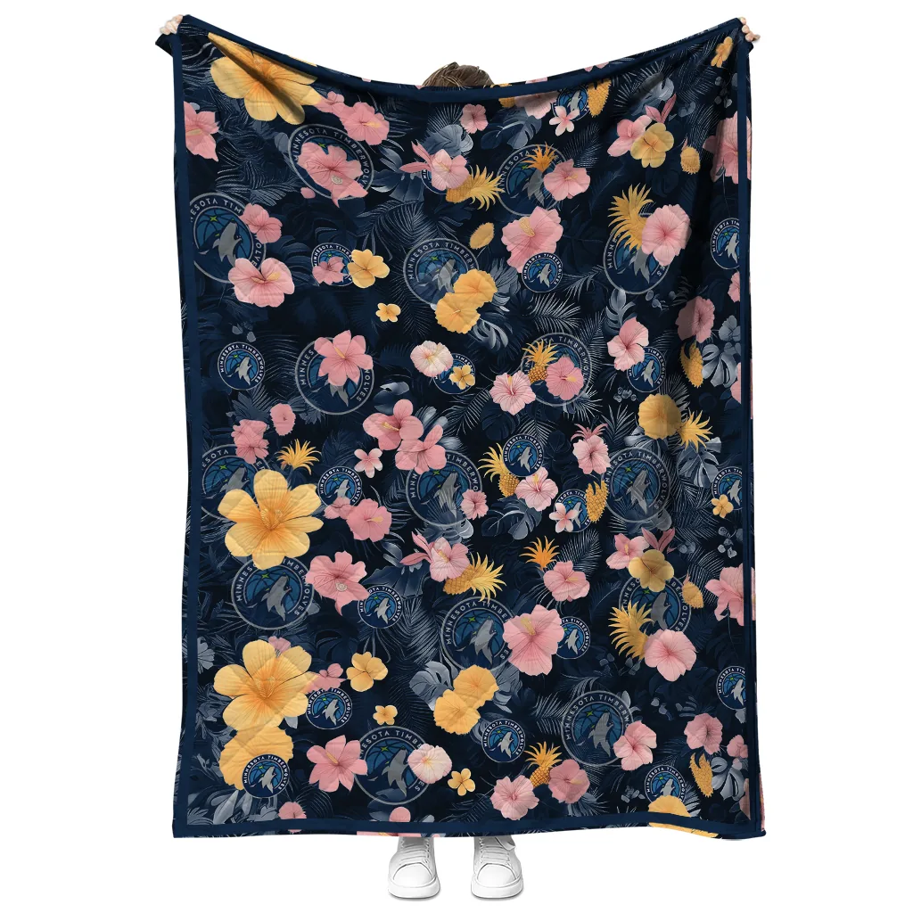 Minnesota Timberwolves Hibiscus Foliage Midnight Blue Quilt Blanket
