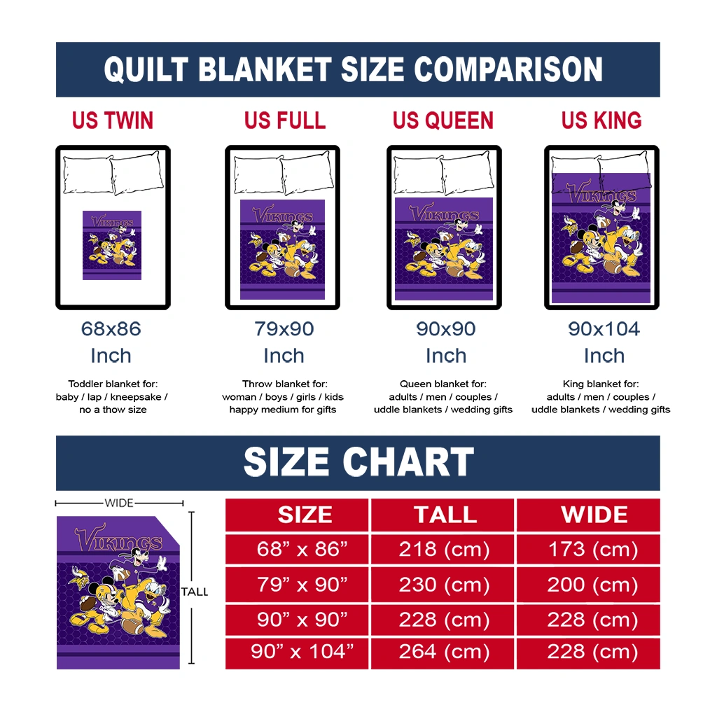 Wrap yourself in warmth and pride with the Minnesota Vikings Disney Football Purple Quilt Blanket from the Minnesota Vikings Blankets collection at Yes That Blanket. Made from 100% premium quilting-weight polyester blended with a touch of microfiber, this quilt offers a smooth, soft finish you’ll love. Choose between two quilting styles—Stipple or Diagonal—and enjoy the comfort of a cotton-filled layer inside that adds extra coziness for every season. The border is available in classic black or white, giving your design a clean, timeless edge.