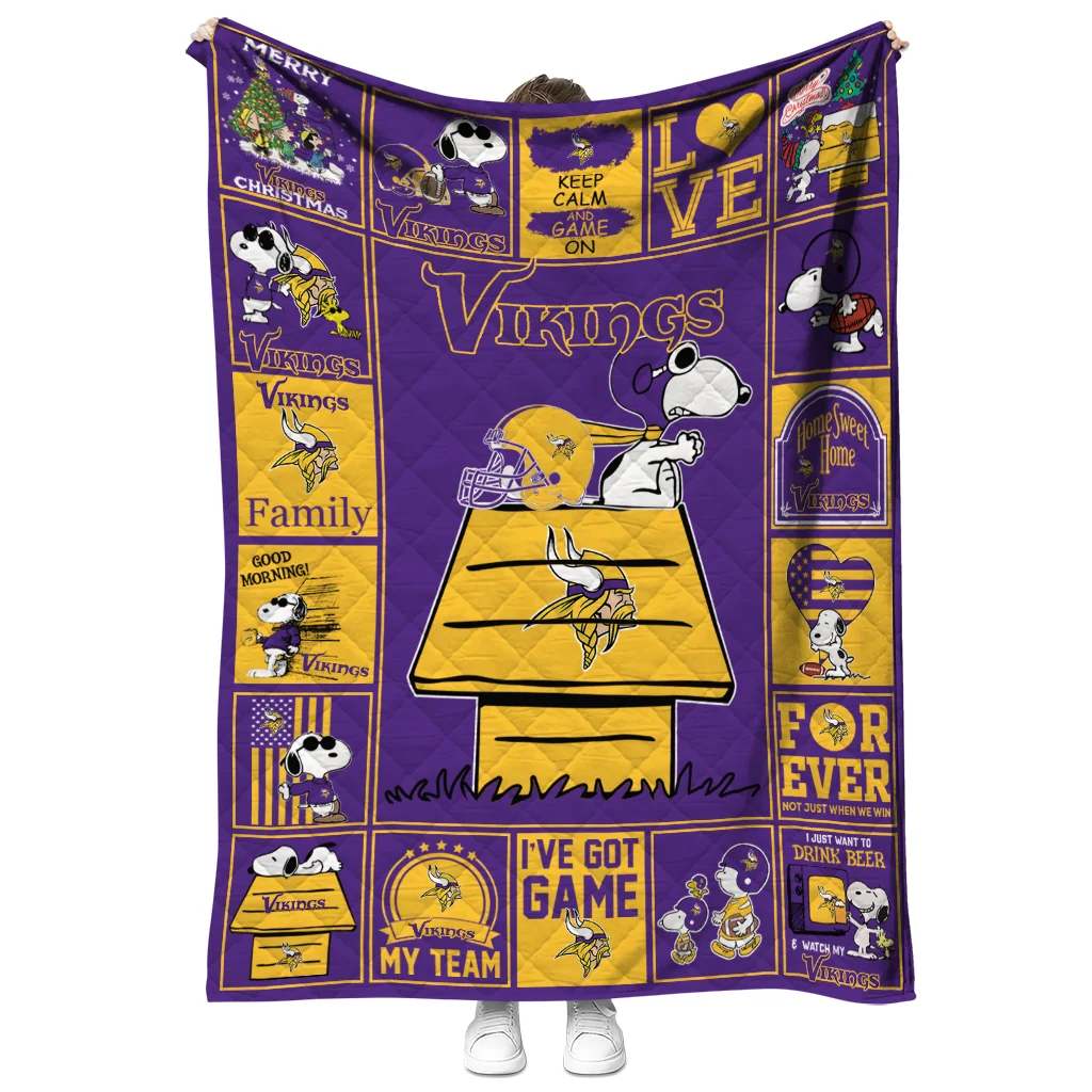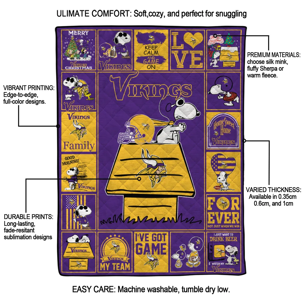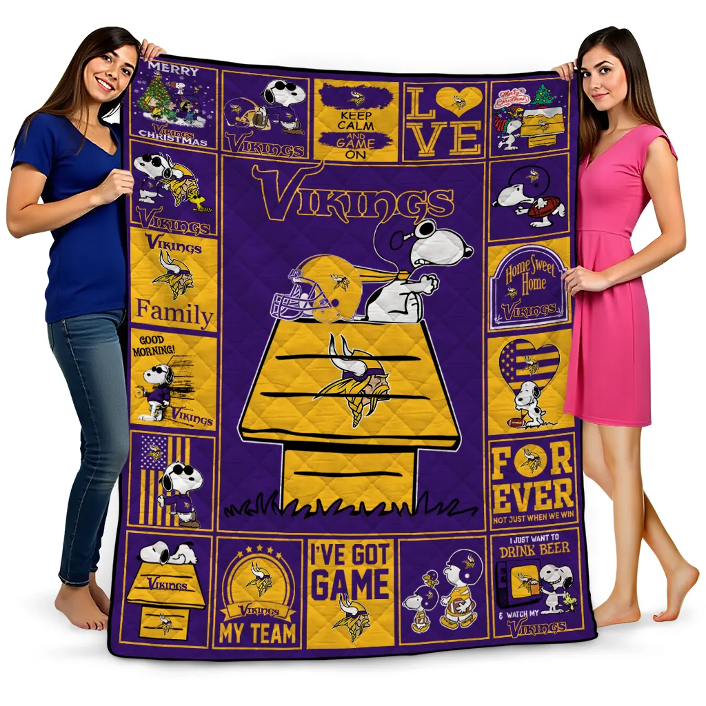 Wrap yourself in warmth and pride with the Minnesota Vikings Snoopy Love Purple Quilt Blanket from the Minnesota Vikings Blankets collection at Yes That Blanket. Made from 100% premium quilting-weight polyester blended with a touch of microfiber, this quilt offers a smooth, soft finish you’ll love. Choose between two quilting styles—Stipple or Diagonal—and enjoy the comfort of a cotton-filled layer inside that adds extra coziness for every season. The border is available in classic black or white, giving your design a clean, timeless edge.