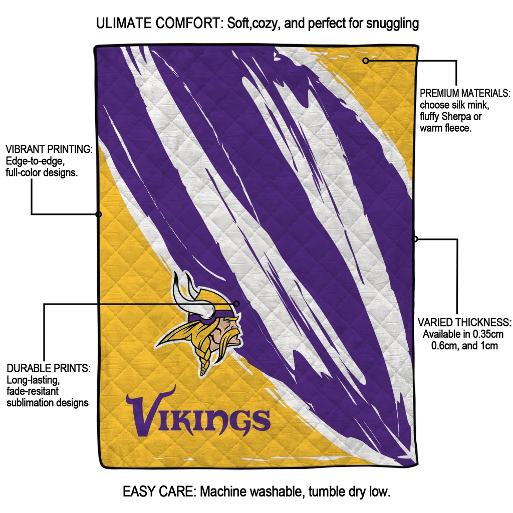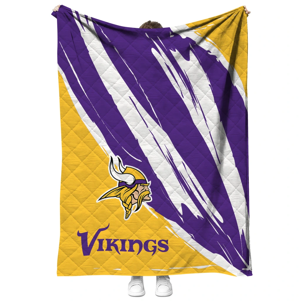 The Minnesota Vikings Stroke Art Purple White Quilt Blanket is more than a blanket—it’s everyday comfort, thoughtfully made. Crafted from premium quilting fabric with a soft microfiber touch, it offers a smooth hand-feel and lasting coziness. Layered quilting with a cotton-filled core provides adaptable warmth across seasons while maintaining a clean, tailored look on your bed or sofa.