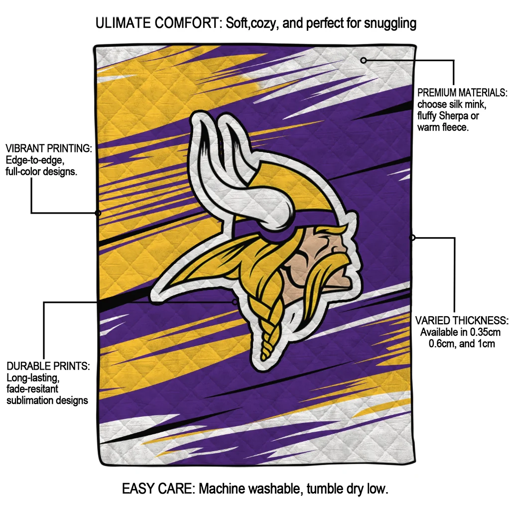 The Minnesota Vikings Wild Lines Purple White Quilt Blanket is more than a blanket—it’s everyday comfort, thoughtfully made. Crafted from premium quilting fabric with a soft microfiber touch, it offers a smooth hand-feel and lasting coziness. Layered quilting with a cotton-filled core provides adaptable warmth across seasons while maintaining a clean, tailored look on your bed or sofa.