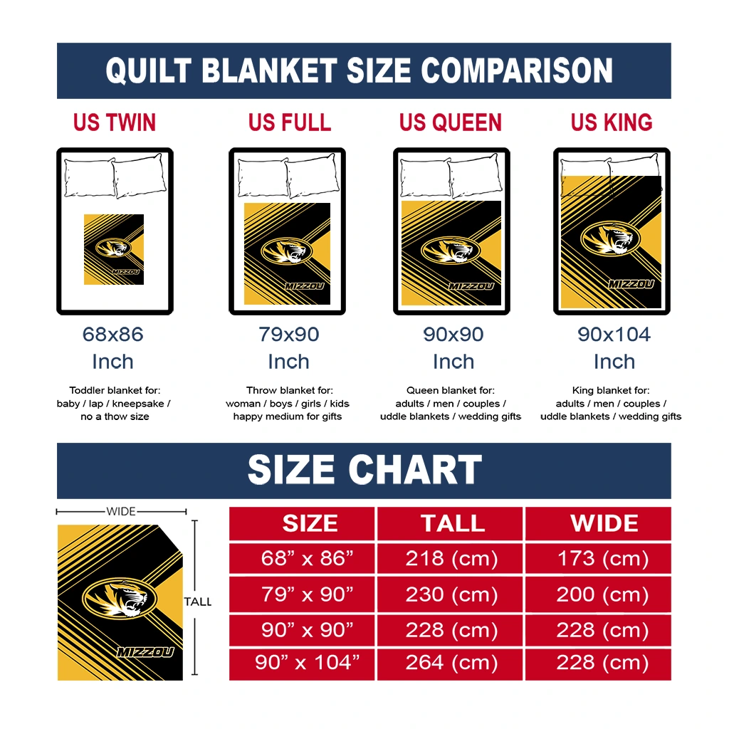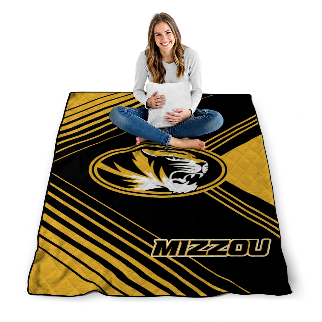 Wrap yourself in warmth and pride with the Missouri Tigers Arrow Layers Black Quilt Blanket from the Missouri Tigers Blankets collection at Yes That Blanket. Made from 100% premium quilting-weight polyester blended with a touch of microfiber, this quilt offers a smooth, soft finish you’ll love. Choose between two quilting styles—Stipple or Diagonal—and enjoy the comfort of a cotton-filled layer inside that adds extra coziness for every season. The border is available in classic black or white, giving your design a clean, timeless edge.