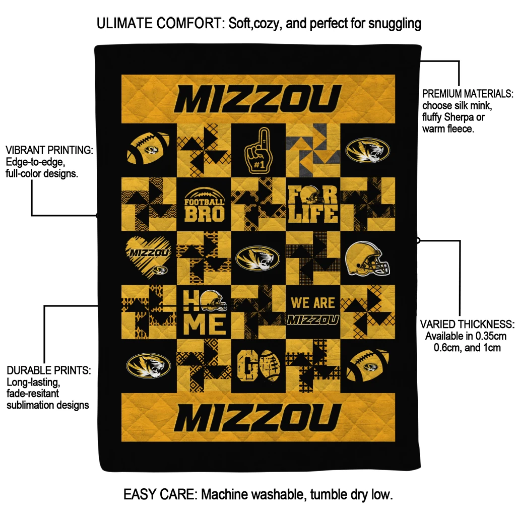 Wrap yourself in warmth and pride with the Missouri Tigers Helmet Heart Black Quilt Blanket from the Missouri Tigers Blankets collection at Yes That Blanket. Made from 100% premium quilting-weight polyester blended with a touch of microfiber, this quilt offers a smooth, soft finish you’ll love. Choose between two quilting styles—Stipple or Diagonal—and enjoy the comfort of a cotton-filled layer inside that adds extra coziness for every season. The border is available in classic black or white, giving your design a clean, timeless edge.