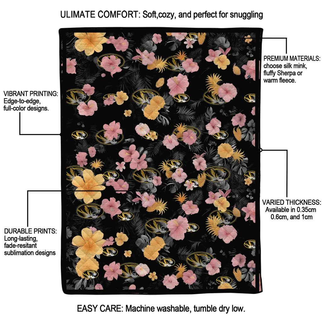 Wrap yourself in warmth and pride with the Missouri Tigers Hibiscus Foliage Black Quilt Blanket from the Missouri Tigers Blankets collection at Yes That Blanket. Made from 100% premium quilting-weight polyester blended with a touch of microfiber, this quilt offers a smooth, soft finish you’ll love. Choose between two quilting styles—Stipple or Diagonal—and enjoy the comfort of a cotton-filled layer inside that adds extra coziness for every season. The border is available in classic black or white, giving your design a clean, timeless edge.