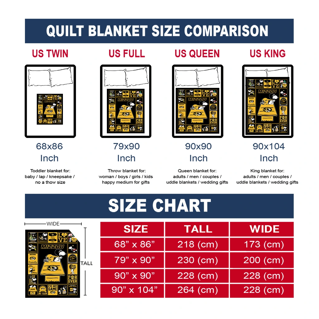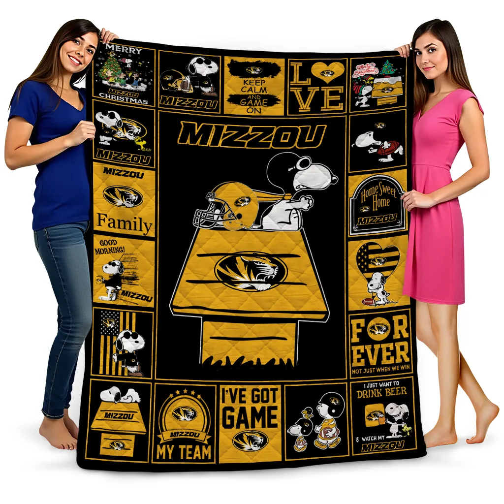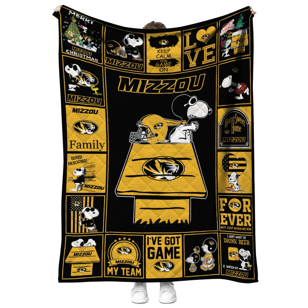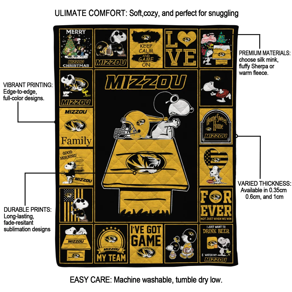 Wrap yourself in warmth and pride with the Missouri Tigers Snoopy Love Black Quilt Blanket from the Missouri Tigers Blankets collection at Yes That Blanket. Made from 100% premium quilting-weight polyester blended with a touch of microfiber, this quilt offers a smooth, soft finish you’ll love. Choose between two quilting styles—Stipple or Diagonal—and enjoy the comfort of a cotton-filled layer inside that adds extra coziness for every season. The border is available in classic black or white, giving your design a clean, timeless edge.