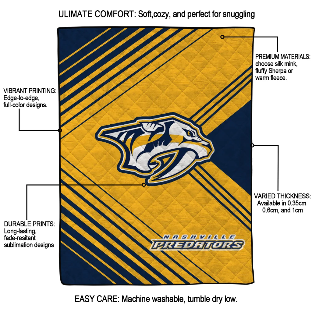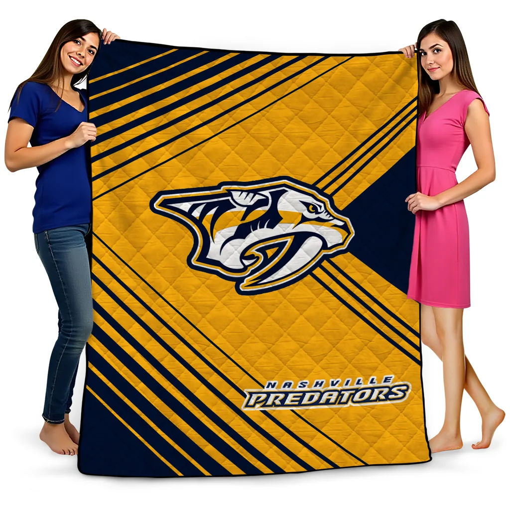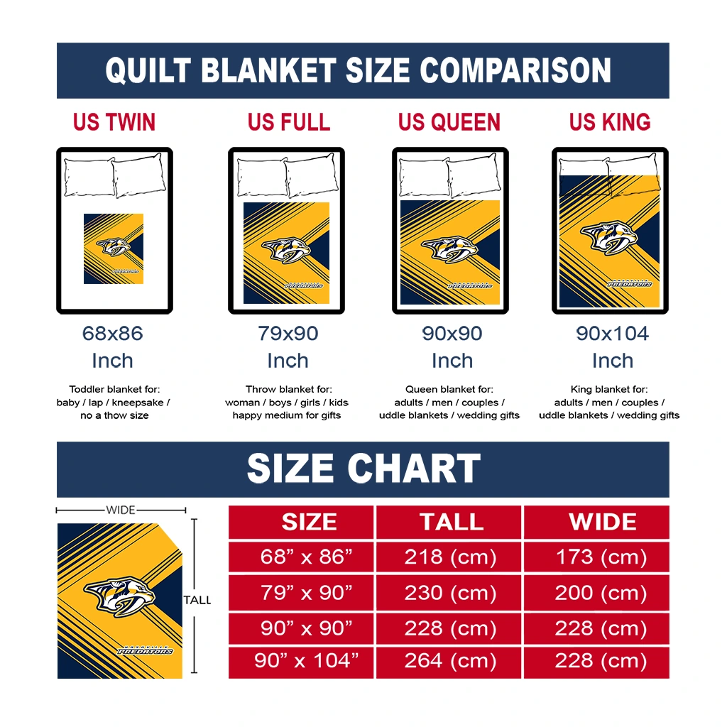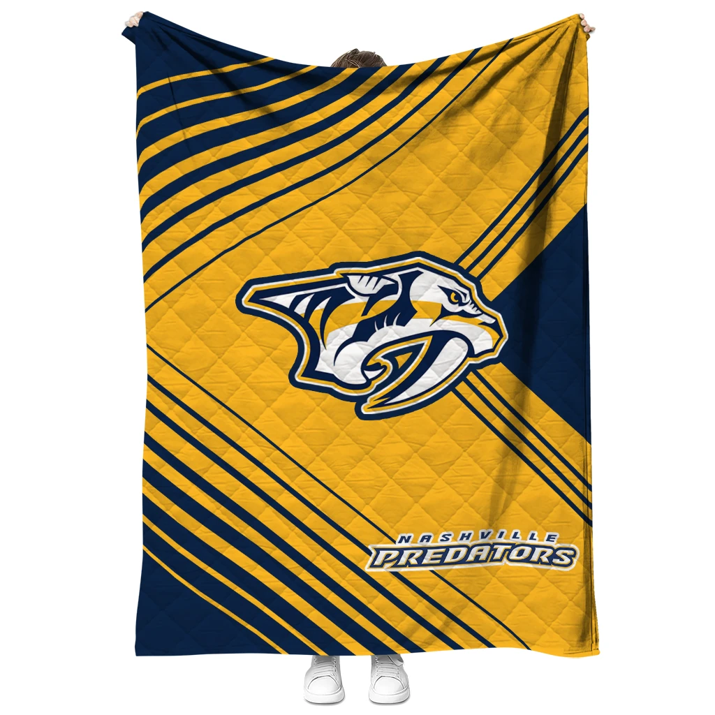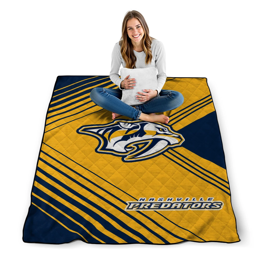 Wrap yourself in warmth and pride with the Nashville Predators Arrow Layers Gold Quilt Blanket from the Nashville Predators Blankets collection at Yes That Blanket. Made from 100% premium quilting-weight polyester blended with a touch of microfiber, this quilt offers a smooth, soft finish you’ll love. Choose between two quilting styles—Stipple or Diagonal—and enjoy the comfort of a cotton-filled layer inside that adds extra coziness for every season. The border is available in classic black or white, giving your design a clean, timeless edge.