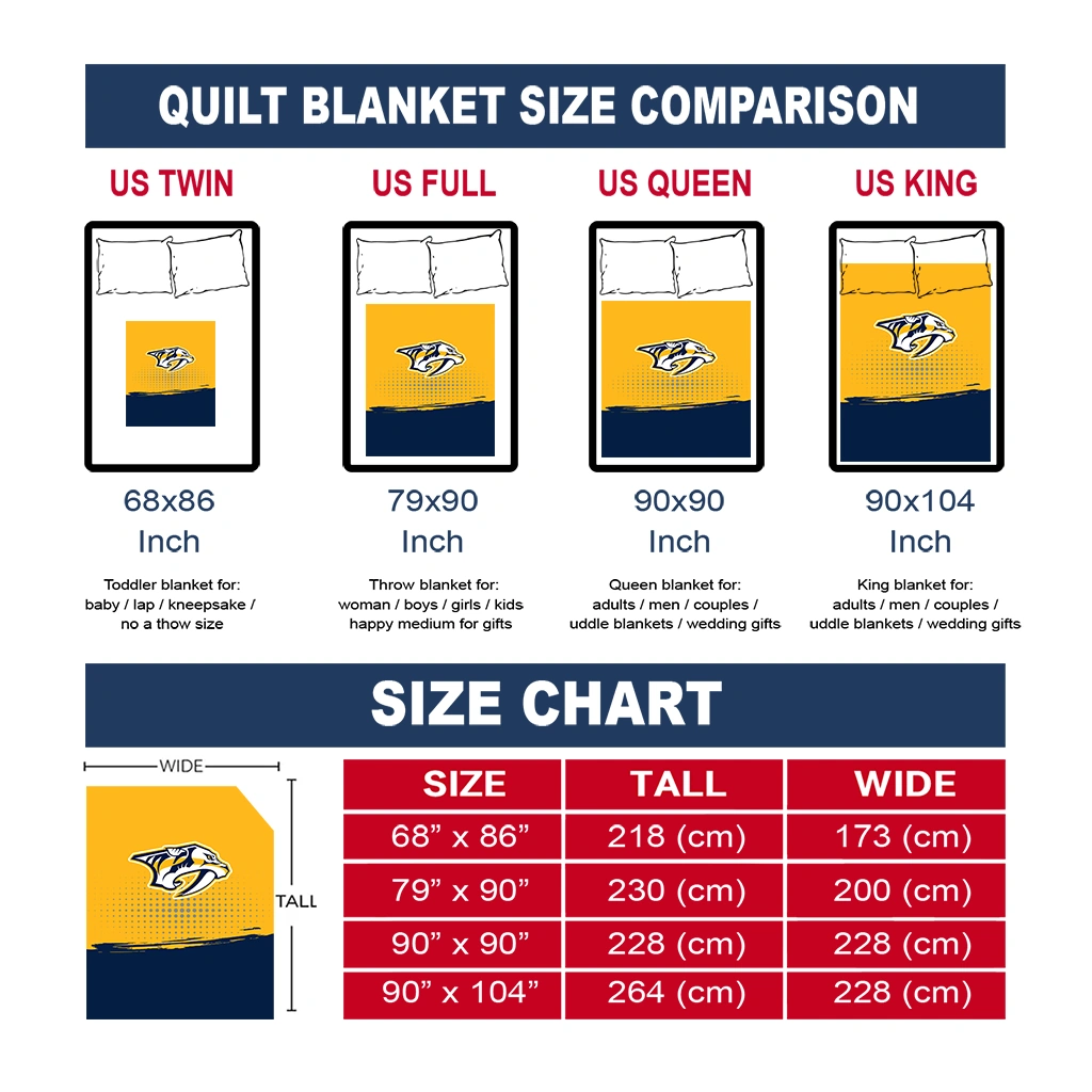Wrap yourself in warmth and pride with the Nashville Predators Dot Illusion Gold Quilt Blanket from the Nashville Predators Blankets collection at Yes That Blanket. Made from 100% premium quilting-weight polyester blended with a touch of microfiber, this quilt offers a smooth, soft finish you’ll love. Choose between two quilting styles—Stipple or Diagonal—and enjoy the comfort of a cotton-filled layer inside that adds extra coziness for every season. The border is available in classic black or white, giving your design a clean, timeless edge.
