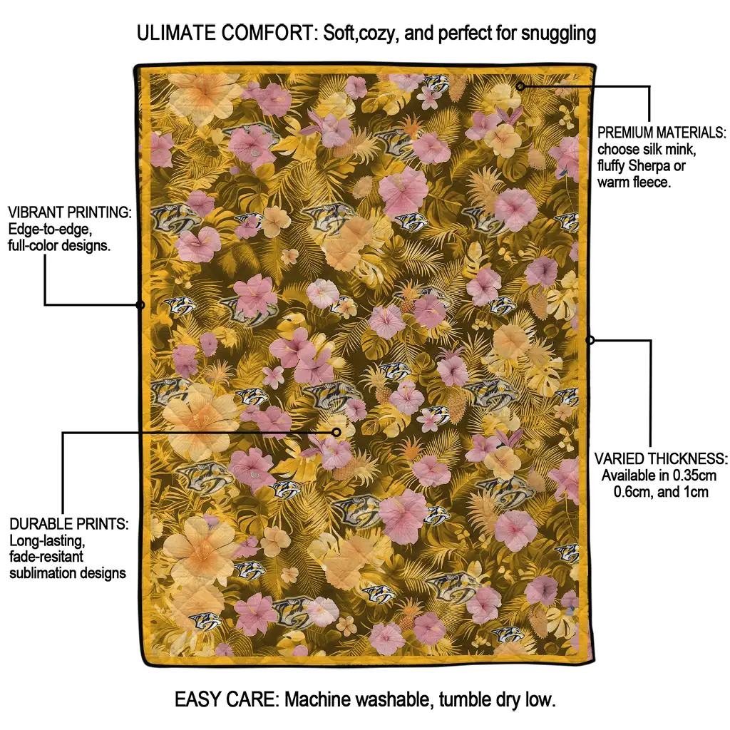 Wrap yourself in warmth and pride with the Nashville Predators Hibiscus Foliage Gold Quilt Blanket from the Nashville Predators Blankets collection at Yes That Blanket. Made from 100% premium quilting-weight polyester blended with a touch of microfiber, this quilt offers a smooth, soft finish you’ll love. Choose between two quilting styles—Stipple or Diagonal—and enjoy the comfort of a cotton-filled layer inside that adds extra coziness for every season. The border is available in classic black or white, giving your design a clean, timeless edge.