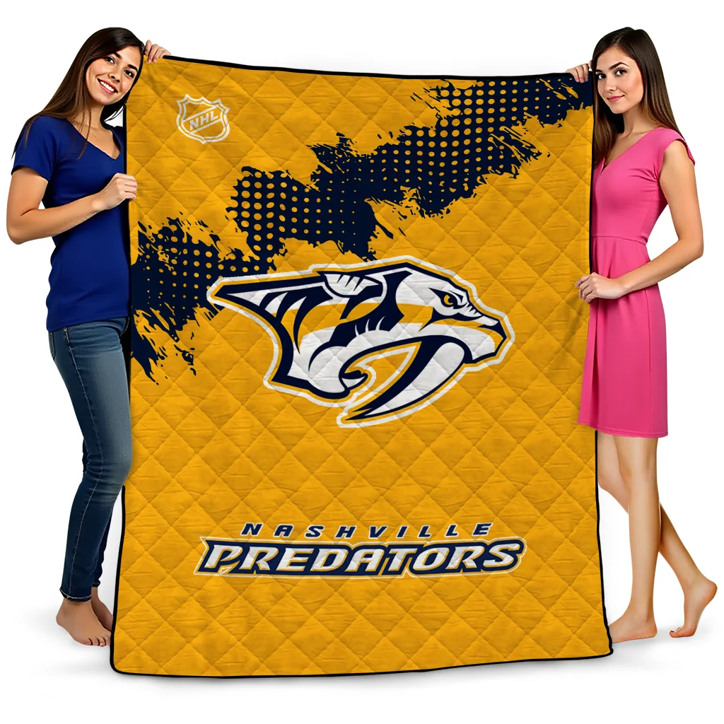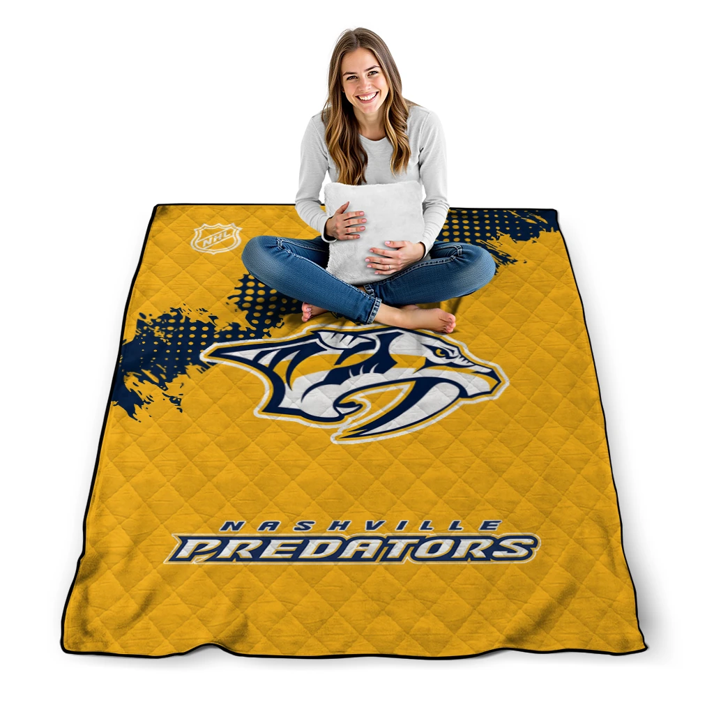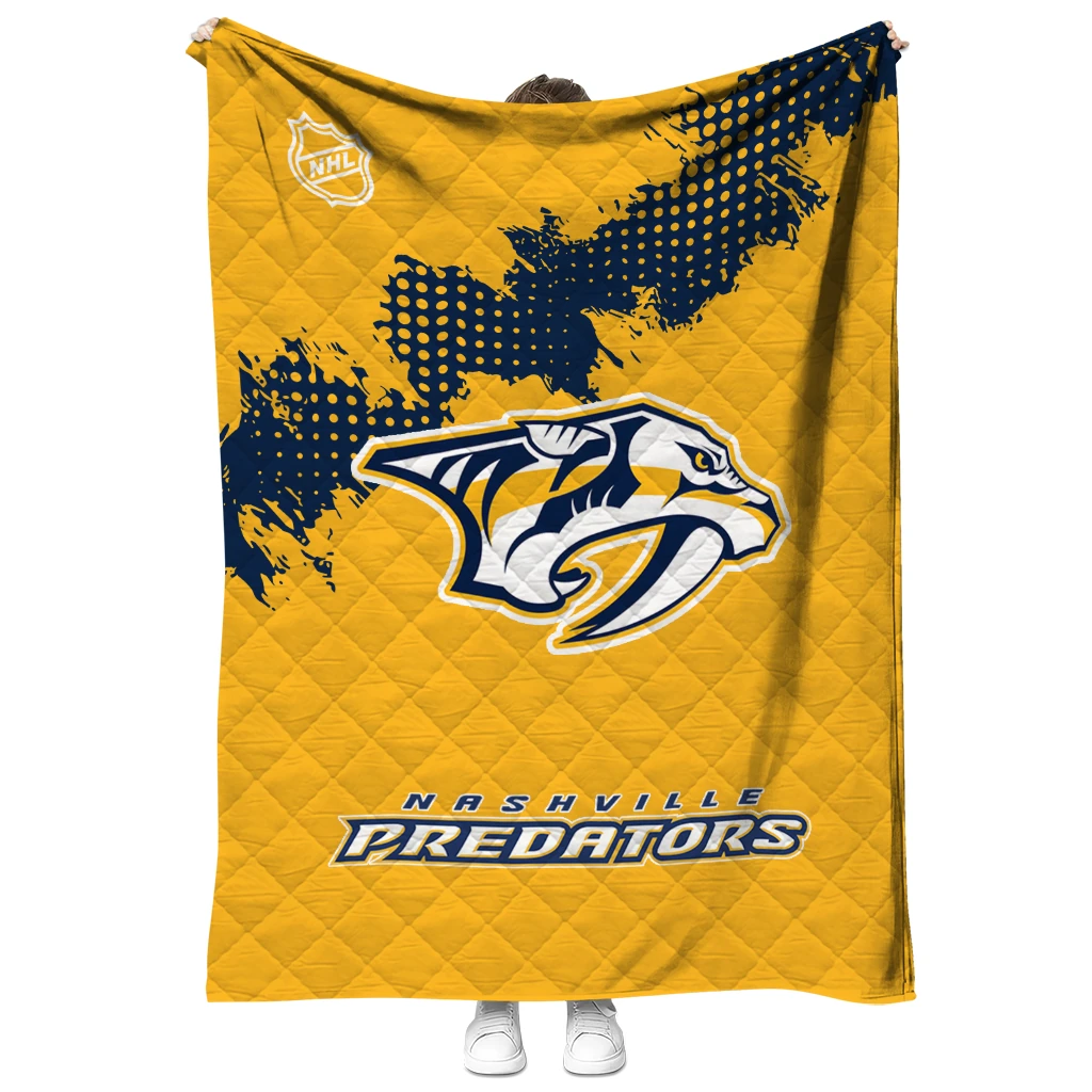 Wrap yourself in warmth and pride with the Nashville Predators NHL Shield Gold Quilt Blanket from the Nashville Predators Blankets collection at Yes That Blanket. Made from 100% premium quilting-weight polyester blended with a touch of microfiber, this quilt offers a smooth, soft finish you’ll love. Choose between two quilting styles—Stipple or Diagonal—and enjoy the comfort of a cotton-filled layer inside that adds extra coziness for every season. The border is available in classic black or white, giving your design a clean, timeless edge.