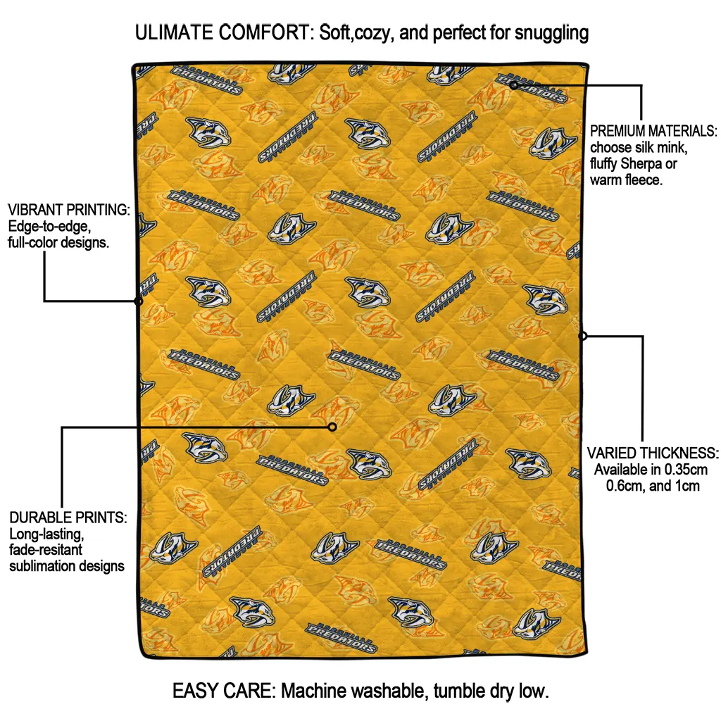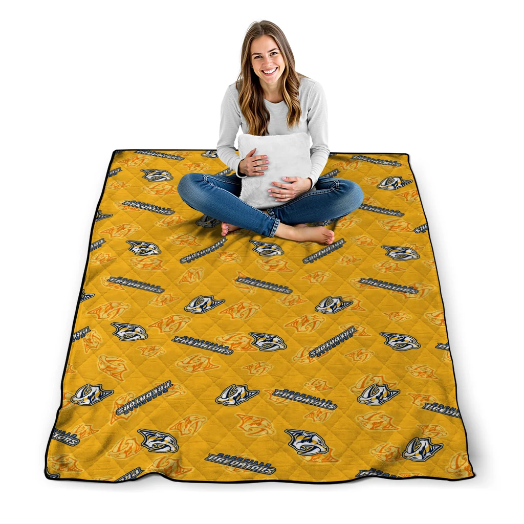 Wrap yourself in warmth and pride with the Nashville Predators Solid Classic Gold Quilt Blanket from the Nashville Predators Blankets collection at Yes That Blanket. Made from 100% premium quilting-weight polyester blended with a touch of microfiber, this quilt offers a smooth, soft finish you’ll love. Choose between two quilting styles—Stipple or Diagonal—and enjoy the comfort of a cotton-filled layer inside that adds extra coziness for every season. The border is available in classic black or white, giving your design a clean, timeless edge.