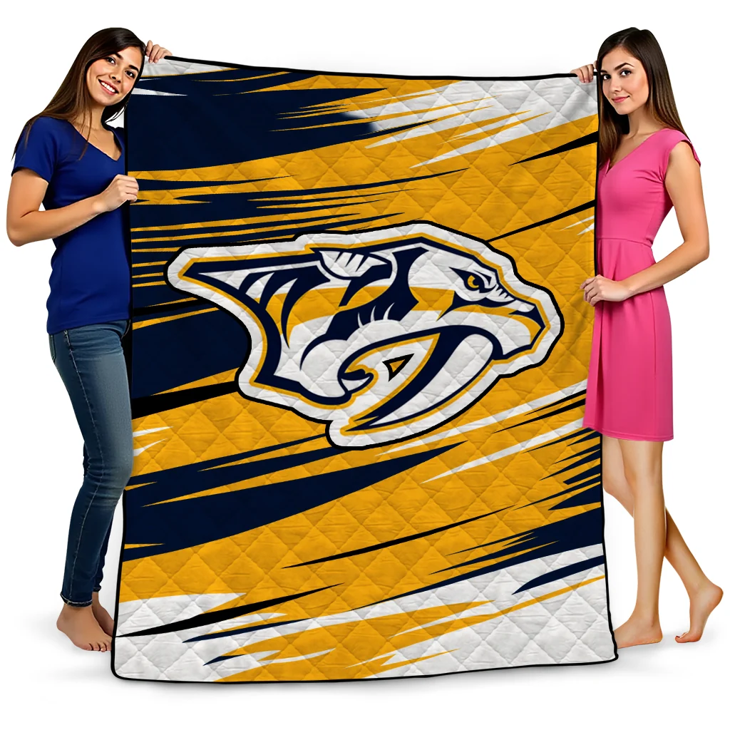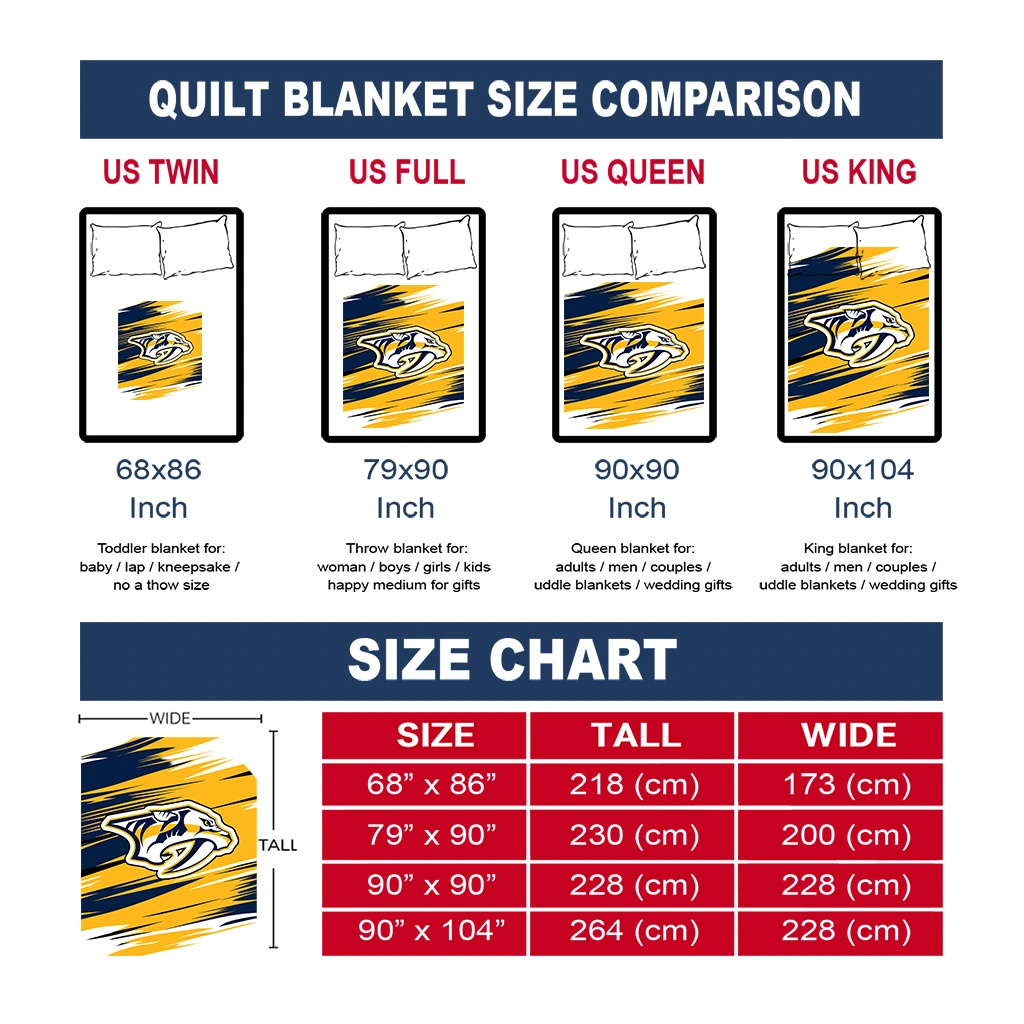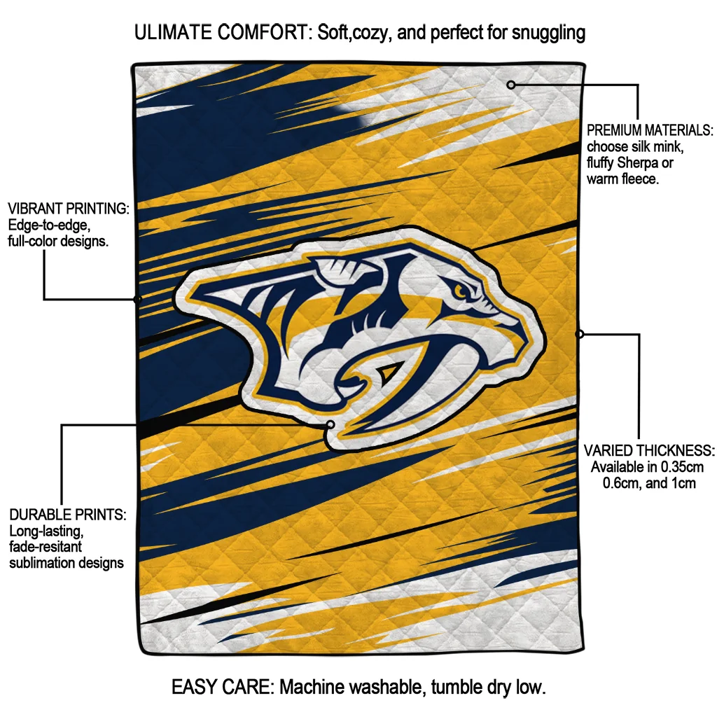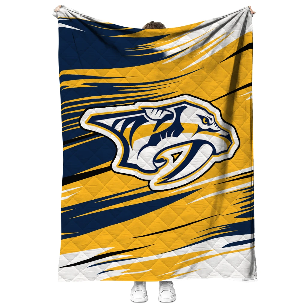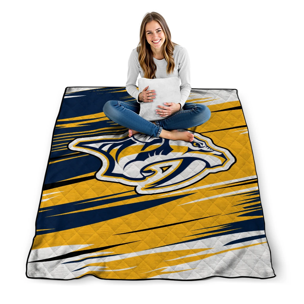 Wrap yourself in warmth and pride with the Nashville Predators Wild Lines Gold White Quilt Blanket from the Nashville Predators Blankets collection at Yes That Blanket. Made from 100% premium quilting-weight polyester blended with a touch of microfiber, this quilt offers a smooth, soft finish you’ll love. Choose between two quilting styles—Stipple or Diagonal—and enjoy the comfort of a cotton-filled layer inside that adds extra coziness for every season. The border is available in classic black or white, giving your design a clean, timeless edge.