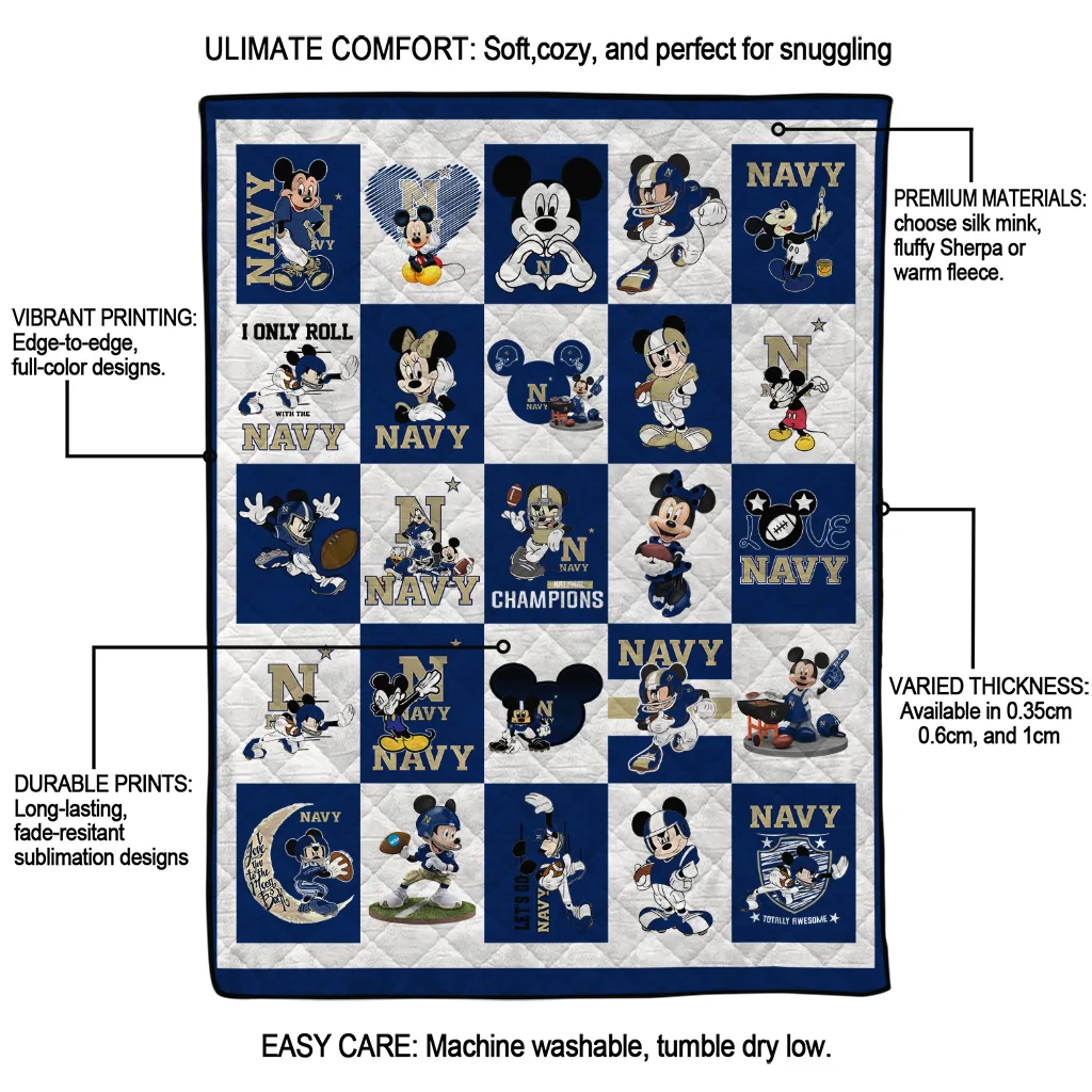 Wrap yourself in warmth and pride with the Navy Midshipmen Mickey Mouse Motif Blue White Quilt Blanket from the Navy Midshipmen Blankets collection at Yes That Blanket. Made from 100% premium quilting-weight polyester blended with a touch of microfiber, this quilt offers a smooth, soft finish you’ll love. Choose between two quilting styles—Stipple or Diagonal—and enjoy the comfort of a cotton-filled layer inside that adds extra coziness for every season. The border is available in classic black or white, giving your design a clean, timeless edge.