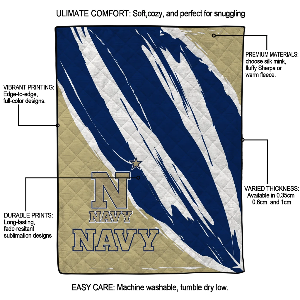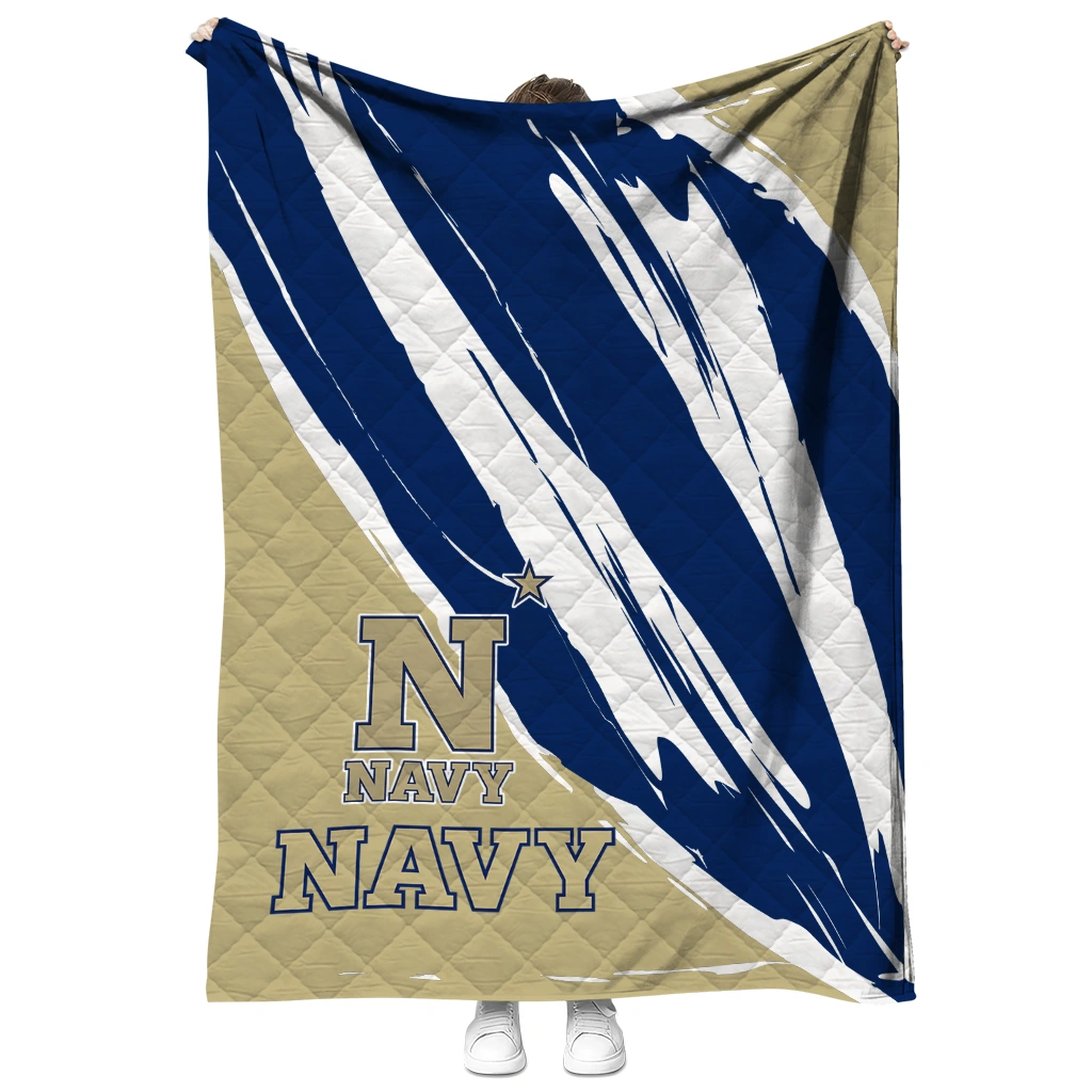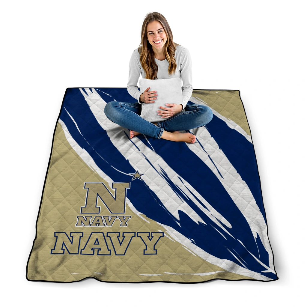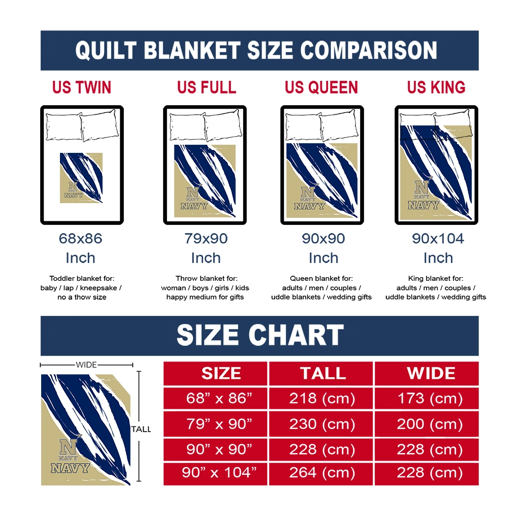 The Navy Midshipmen Stroke Art Blue White Quilt Blanket is more than a blanket—it’s everyday comfort, thoughtfully made. Crafted from premium quilting fabric with a soft microfiber touch, it offers a smooth hand-feel and lasting coziness. Layered quilting with a cotton-filled core provides adaptable warmth across seasons while maintaining a clean, tailored look on your bed or sofa.