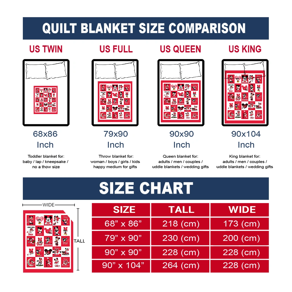 Wrap yourself in warmth and pride with the Nebraska Cornhuskers Mickey Mouse Motif Red White Quilt Blanket from the Nebraska Cornhuskers Blankets collection at Yes That Blanket. Made from 100% premium quilting-weight polyester blended with a touch of microfiber, this quilt offers a smooth, soft finish you’ll love. Choose between two quilting styles—Stipple or Diagonal—and enjoy the comfort of a cotton-filled layer inside that adds extra coziness for every season. The border is available in classic black or white, giving your design a clean, timeless edge.