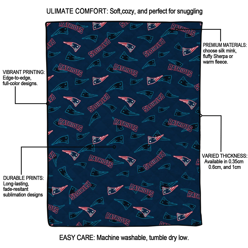 Wrap yourself in warmth and pride with the New England Patriots Solid Classic Blue Quilt Blanket from the New England Patriots Blankets collection at Yes That Blanket. Made from 100% premium quilting-weight polyester blended with a touch of microfiber, this quilt offers a smooth, soft finish you’ll love. Choose between two quilting styles—Stipple or Diagonal—and enjoy the comfort of a cotton-filled layer inside that adds extra coziness for every season. The border is available in classic black or white, giving your design a clean, timeless edge.