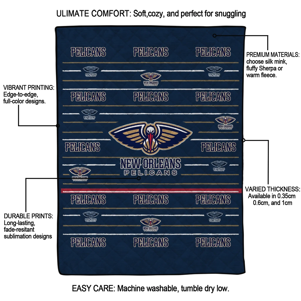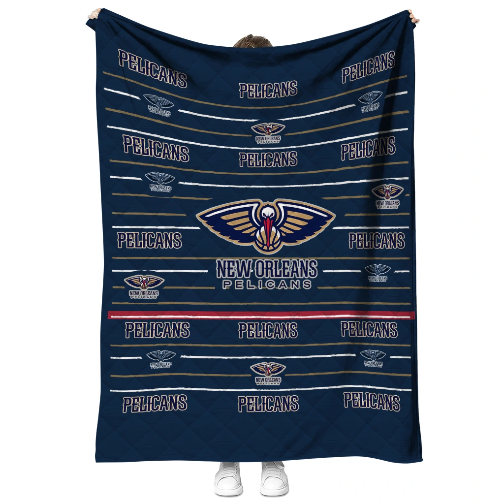 Wrap yourself in warmth and pride with the New Orleans Pelicans Handdrawn Stripes Navy Quilt Blanket from the New Orleans Pelicans Blankets collection at Yes That Blanket. Made from 100% premium quilting-weight polyester blended with a touch of microfiber, this quilt offers a smooth, soft finish you’ll love. Choose between two quilting styles—Stipple or Diagonal—and enjoy the comfort of a cotton-filled layer inside that adds extra coziness for every season. The border is available in classic black or white, giving your design a clean, timeless edge.