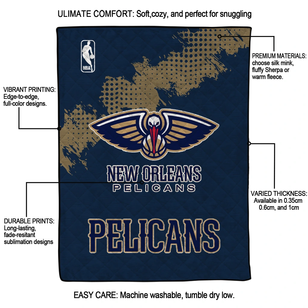The New Orleans Pelicans NBA Grunge Navy Quilt Blanket is more than a blanket—it’s everyday comfort, thoughtfully made. Crafted from premium quilting fabric with a soft microfiber touch, it offers a smooth hand-feel and lasting coziness. Layered quilting with a cotton-filled core provides adaptable warmth across seasons while maintaining a clean, tailored look on your bed or sofa.