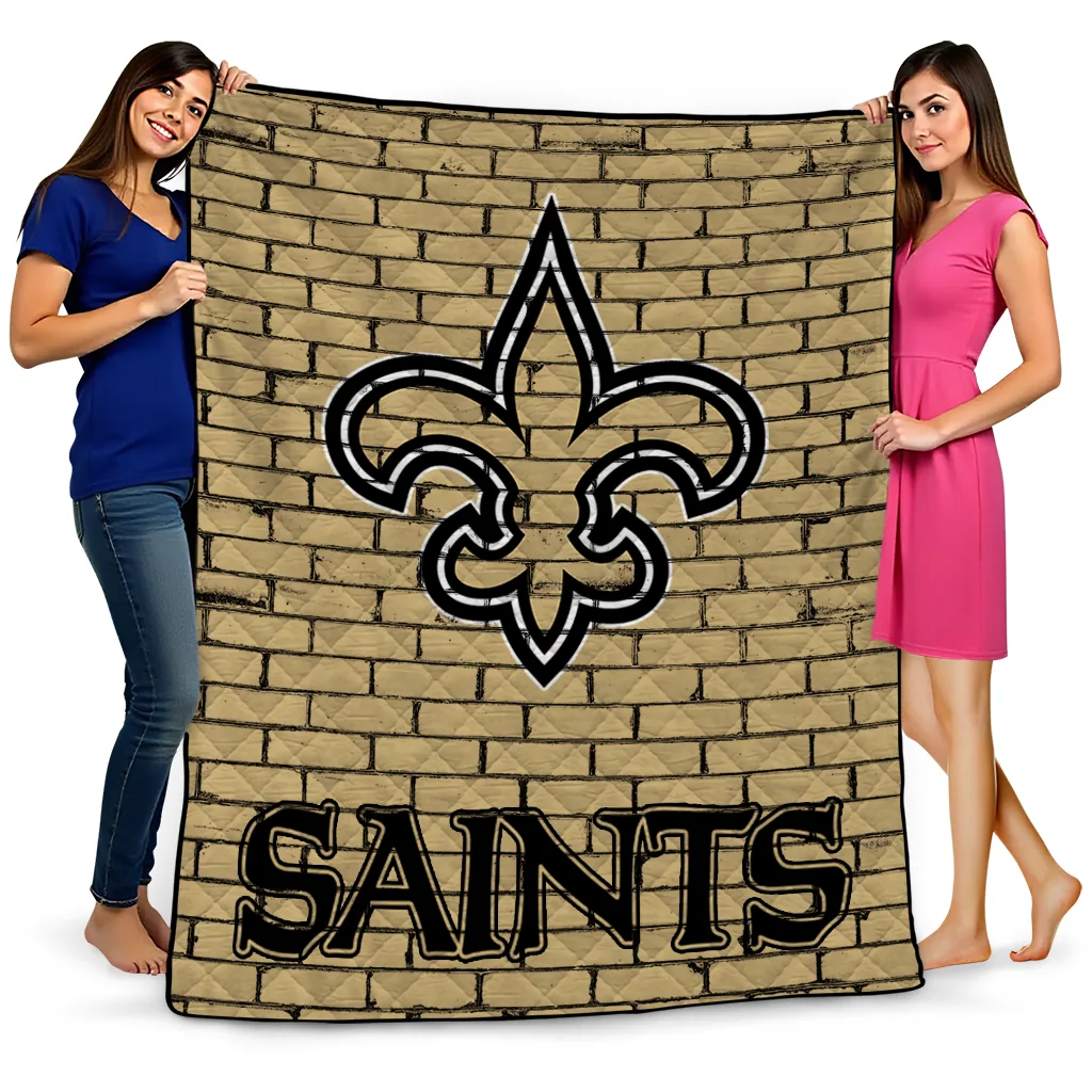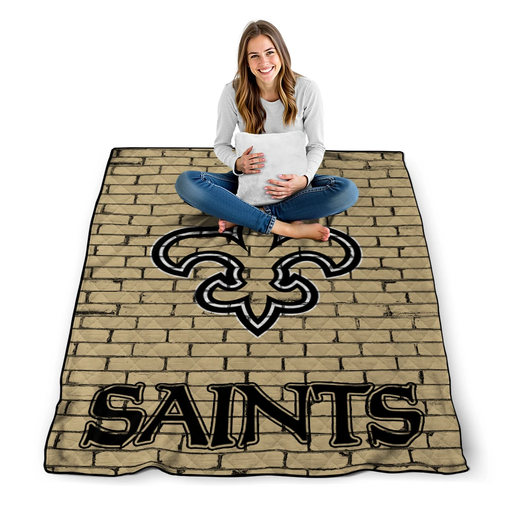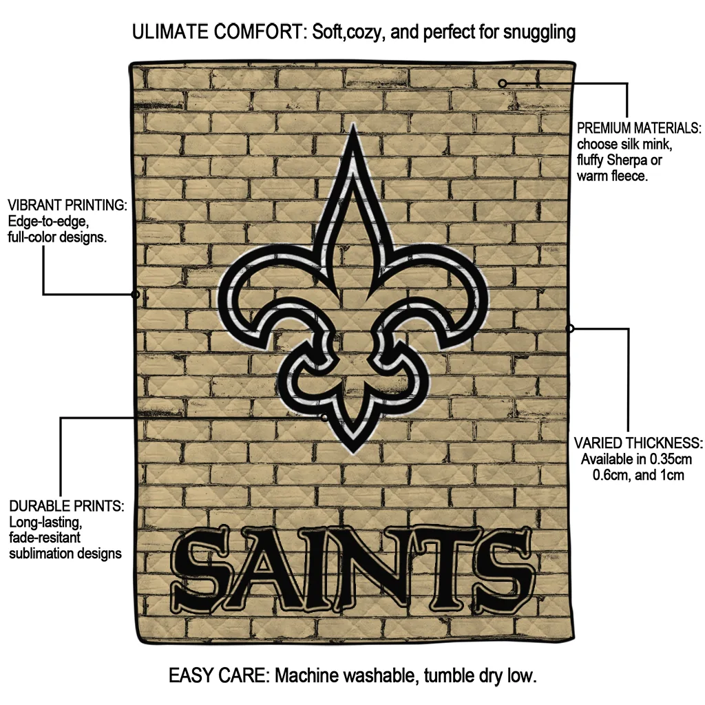Wrap yourself in warmth and pride with the New Orleans Saints Brick Grid Gold Quilt Blanket from the New Orleans Saints Blankets collection at Yes That Blanket. Made from 100% premium quilting-weight polyester blended with a touch of microfiber, this quilt offers a smooth, soft finish you’ll love. Choose between two quilting styles—Stipple or Diagonal—and enjoy the comfort of a cotton-filled layer inside that adds extra coziness for every season. The border is available in classic black or white, giving your design a clean, timeless edge.