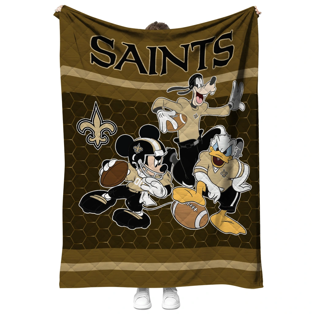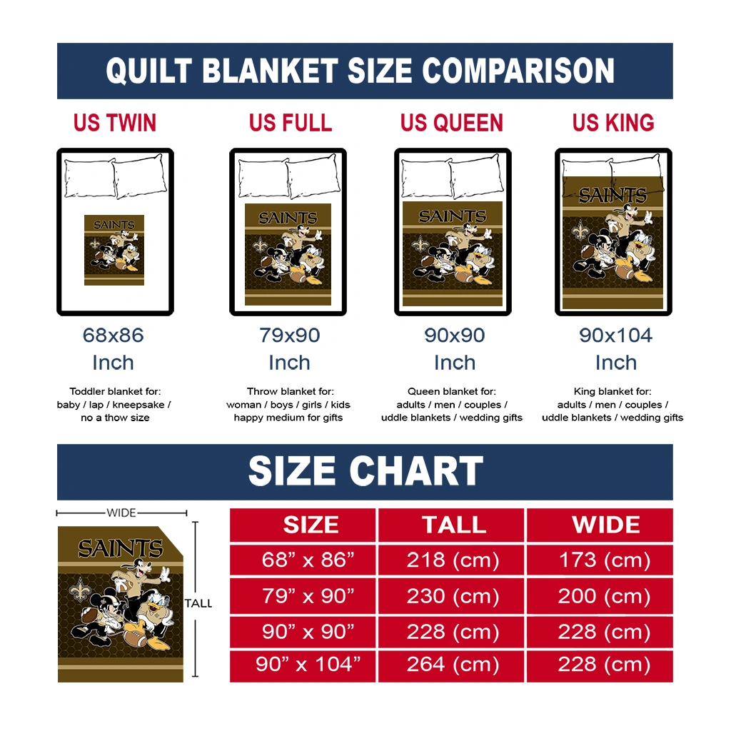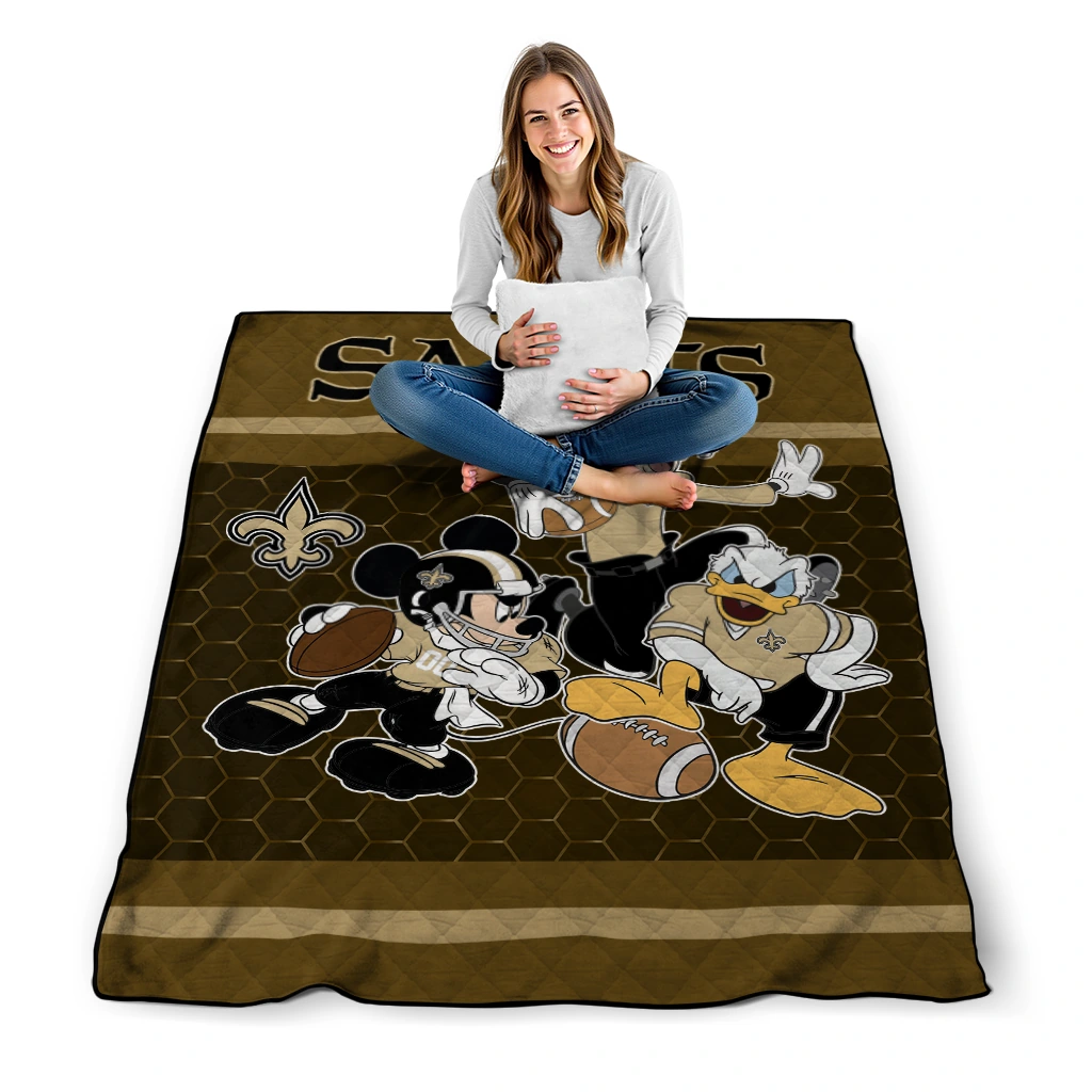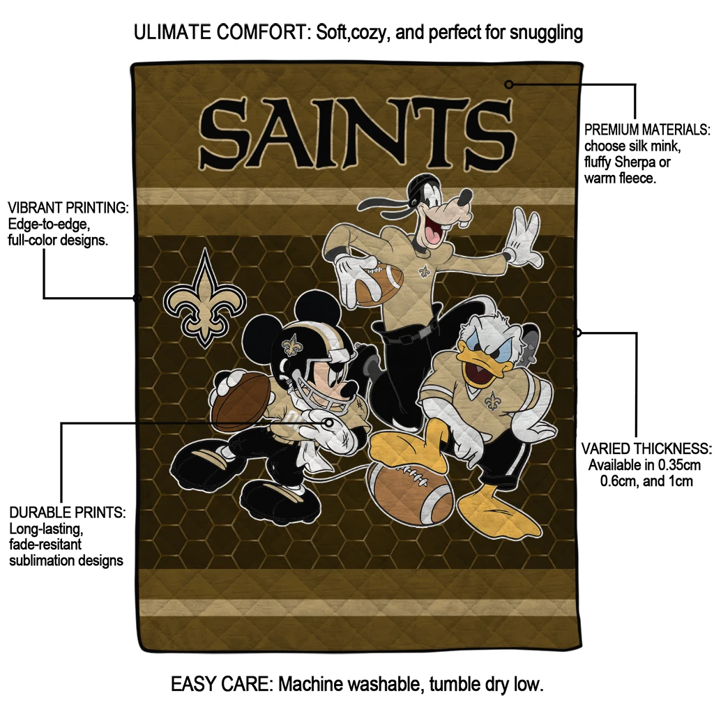 Wrap yourself in warmth and pride with the New Orleans Saints Disney Football Gold Quilt Blanket from the New Orleans Saints Blankets collection at Yes That Blanket. Made from 100% premium quilting-weight polyester blended with a touch of microfiber, this quilt offers a smooth, soft finish you’ll love. Choose between two quilting styles—Stipple or Diagonal—and enjoy the comfort of a cotton-filled layer inside that adds extra coziness for every season. The border is available in classic black or white, giving your design a clean, timeless edge.
