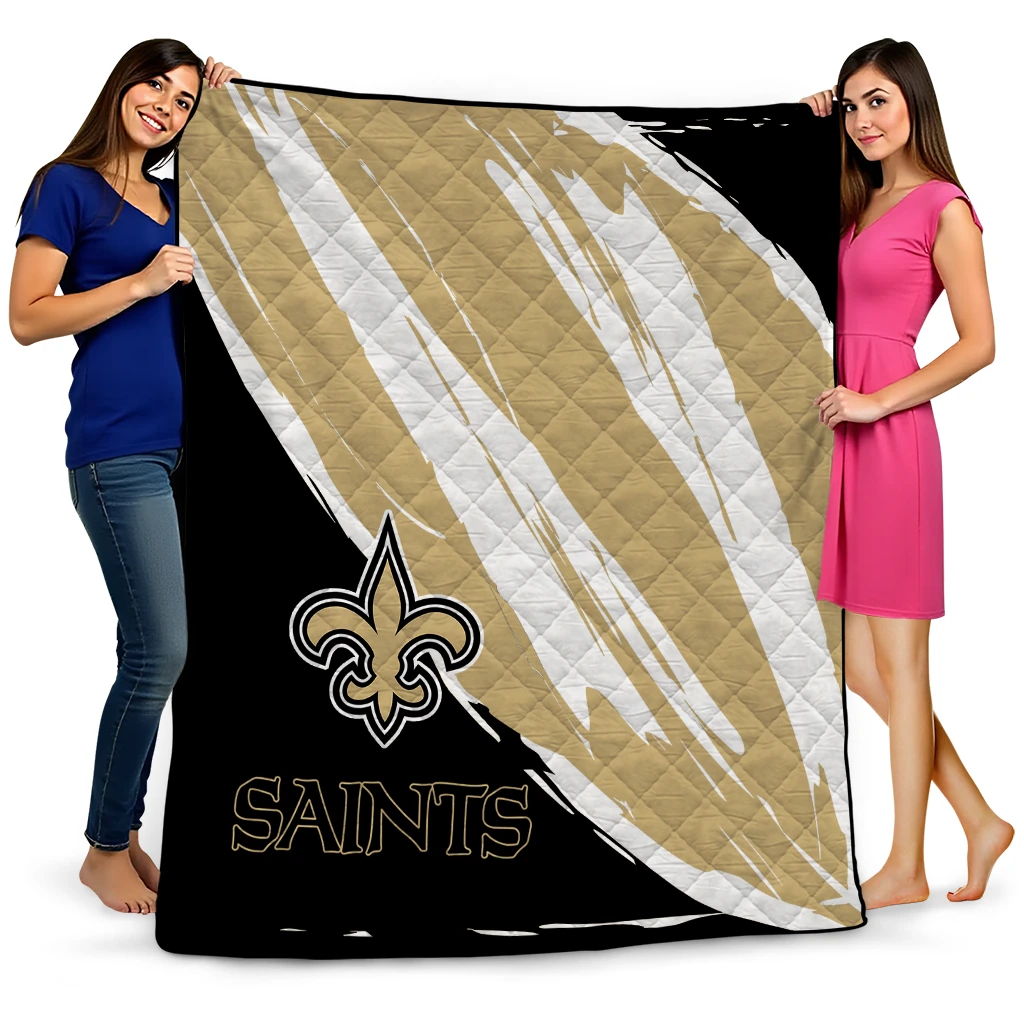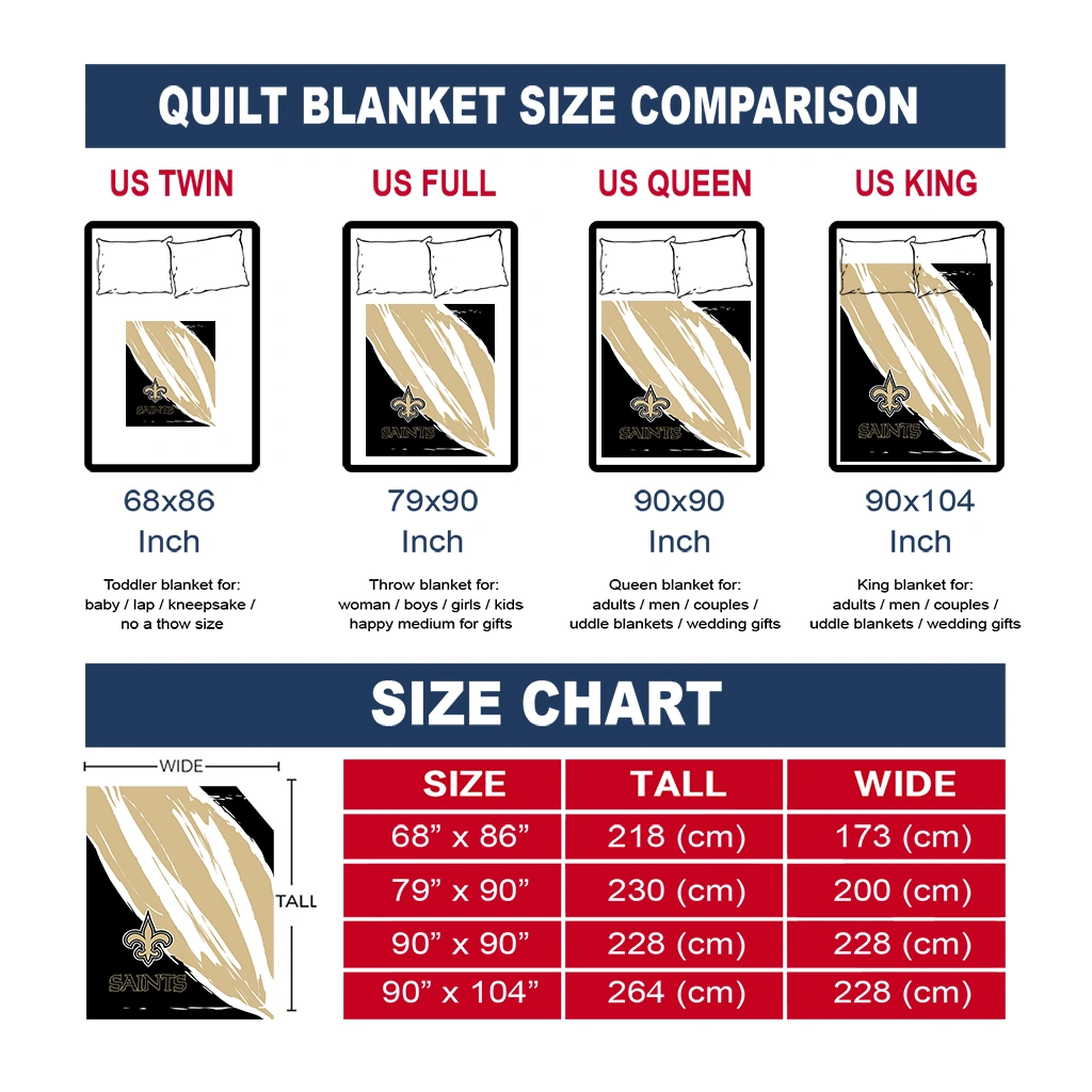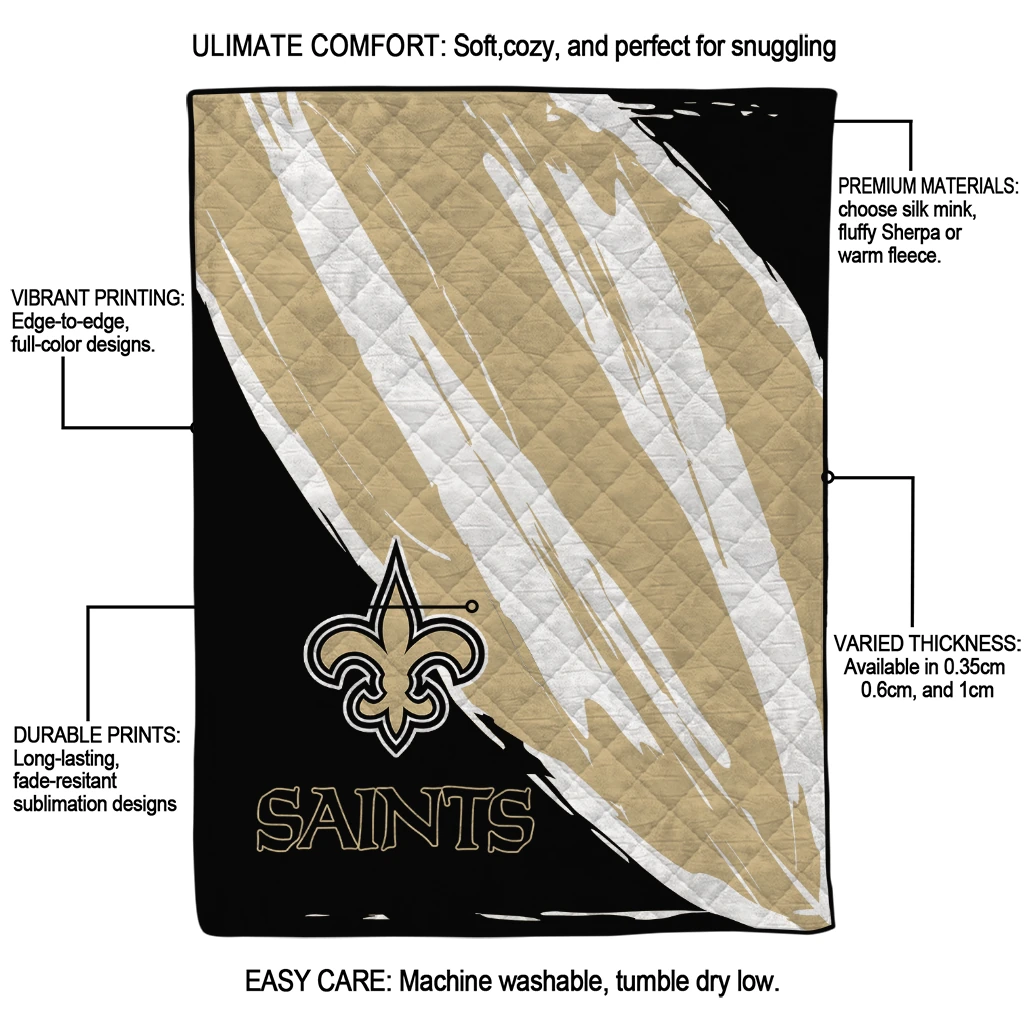 Wrap yourself in warmth and pride with the New Orleans Saints Stroke Art Gold White Quilt Blanket from the New Orleans Saints Blankets collection at Yes That Blanket. Made from 100% premium quilting-weight polyester blended with a touch of microfiber, this quilt offers a smooth, soft finish you’ll love. Choose between two quilting styles—Stipple or Diagonal—and enjoy the comfort of a cotton-filled layer inside that adds extra coziness for every season. The border is available in classic black or white, giving your design a clean, timeless edge.