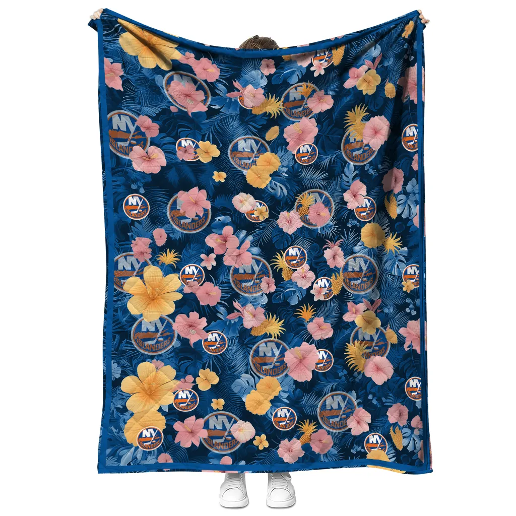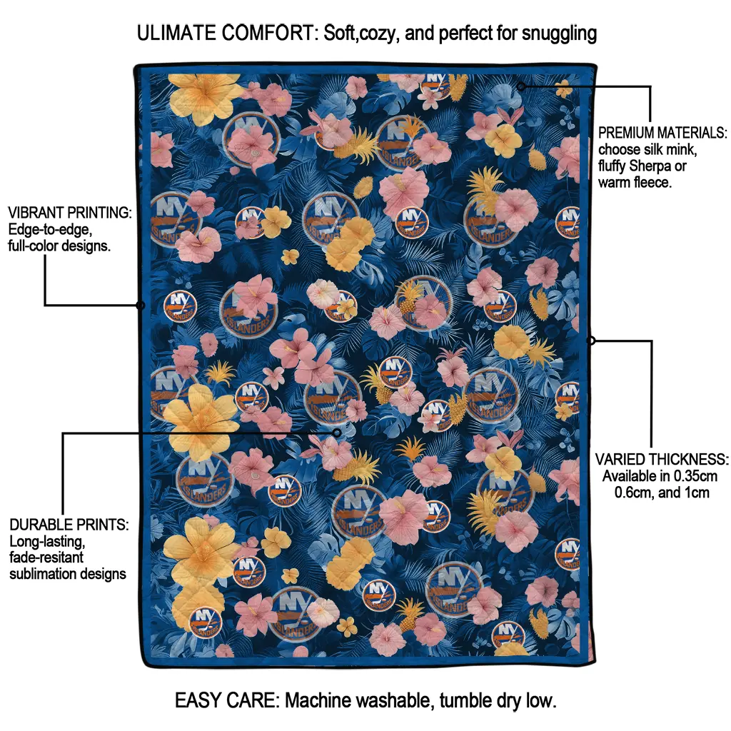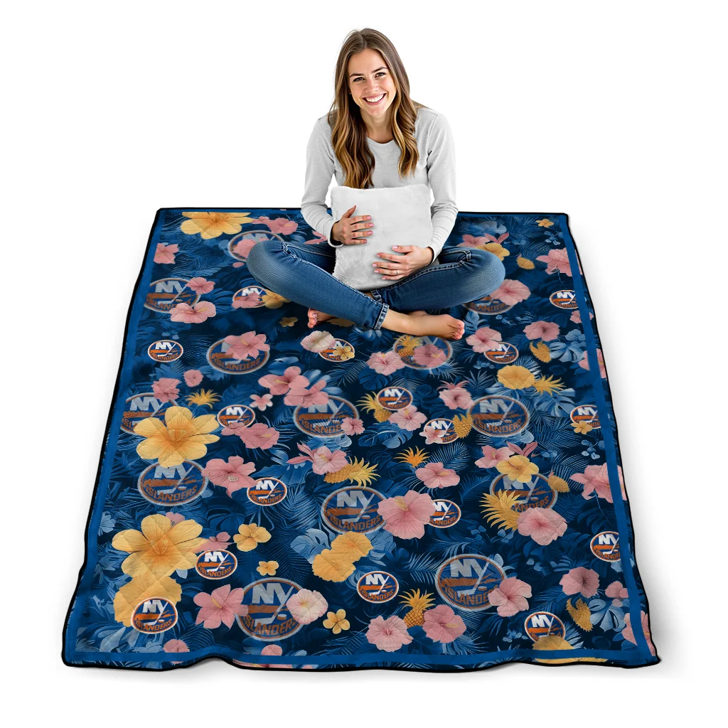 Wrap yourself in warmth and pride with the New York Islanders Hibiscus Foliage Blue Quilt Blanket from the New York Islanders Blankets collection at Yes That Blanket. Made from 100% premium quilting-weight polyester blended with a touch of microfiber, this quilt offers a smooth, soft finish you’ll love. Choose between two quilting styles—Stipple or Diagonal—and enjoy the comfort of a cotton-filled layer inside that adds extra coziness for every season. The border is available in classic black or white, giving your design a clean, timeless edge.