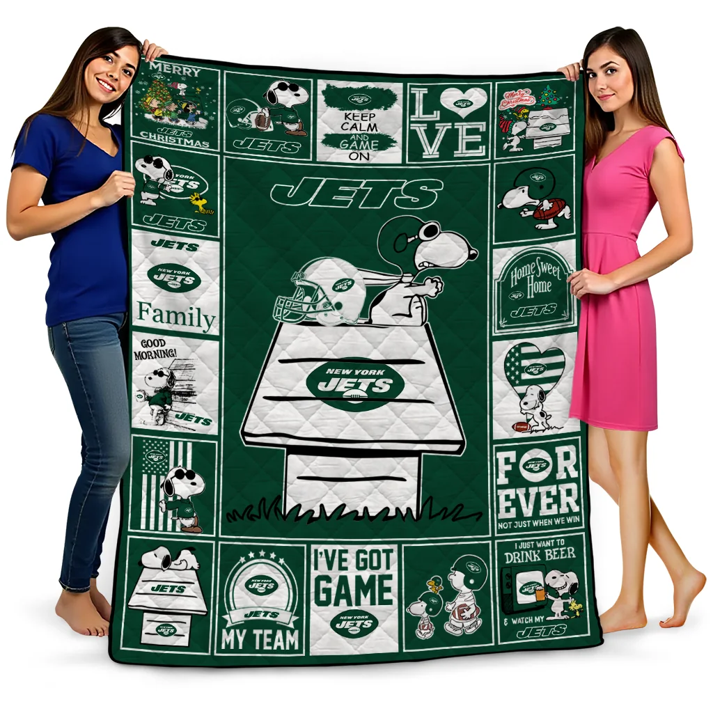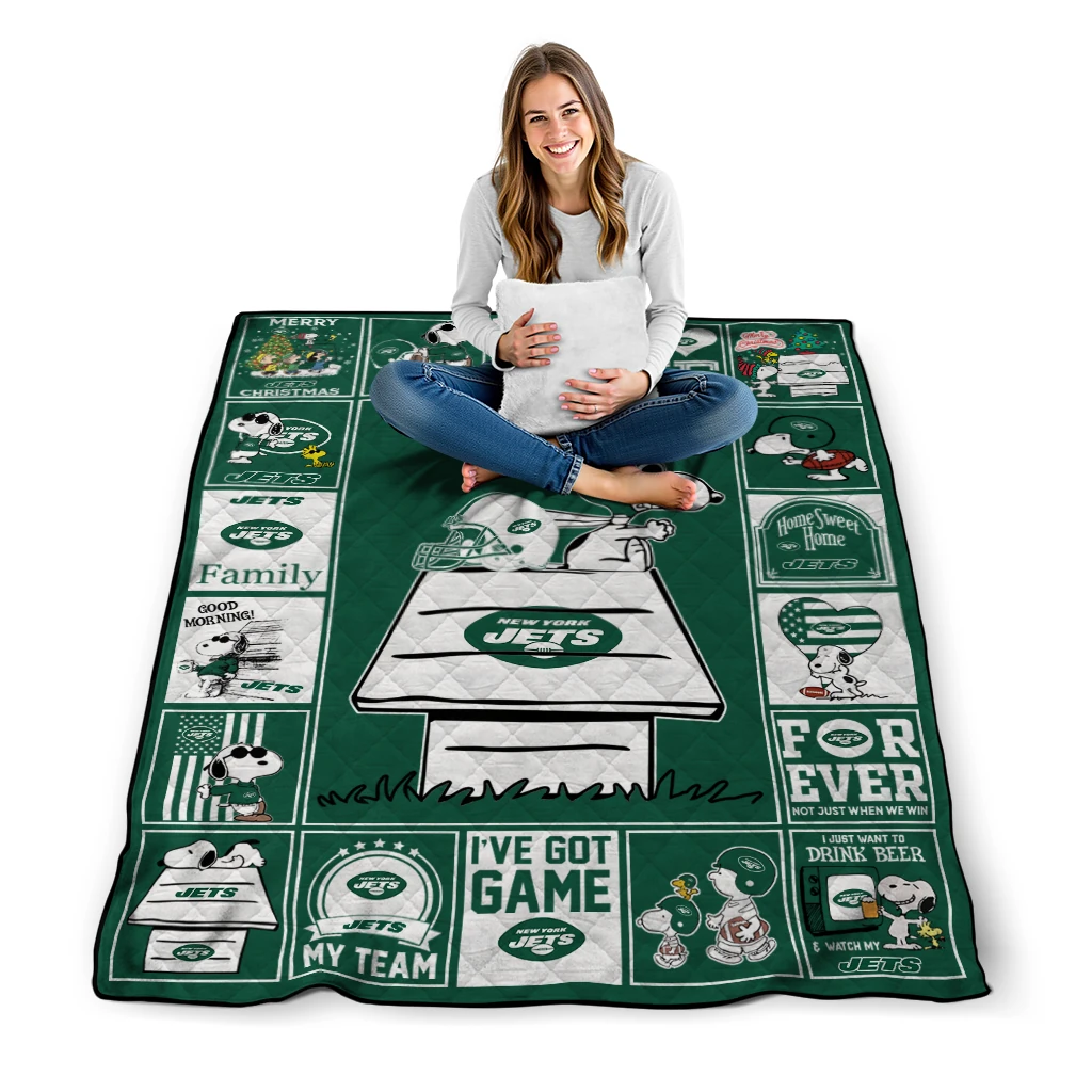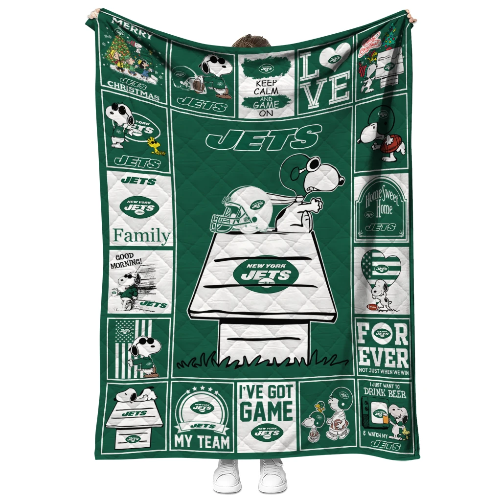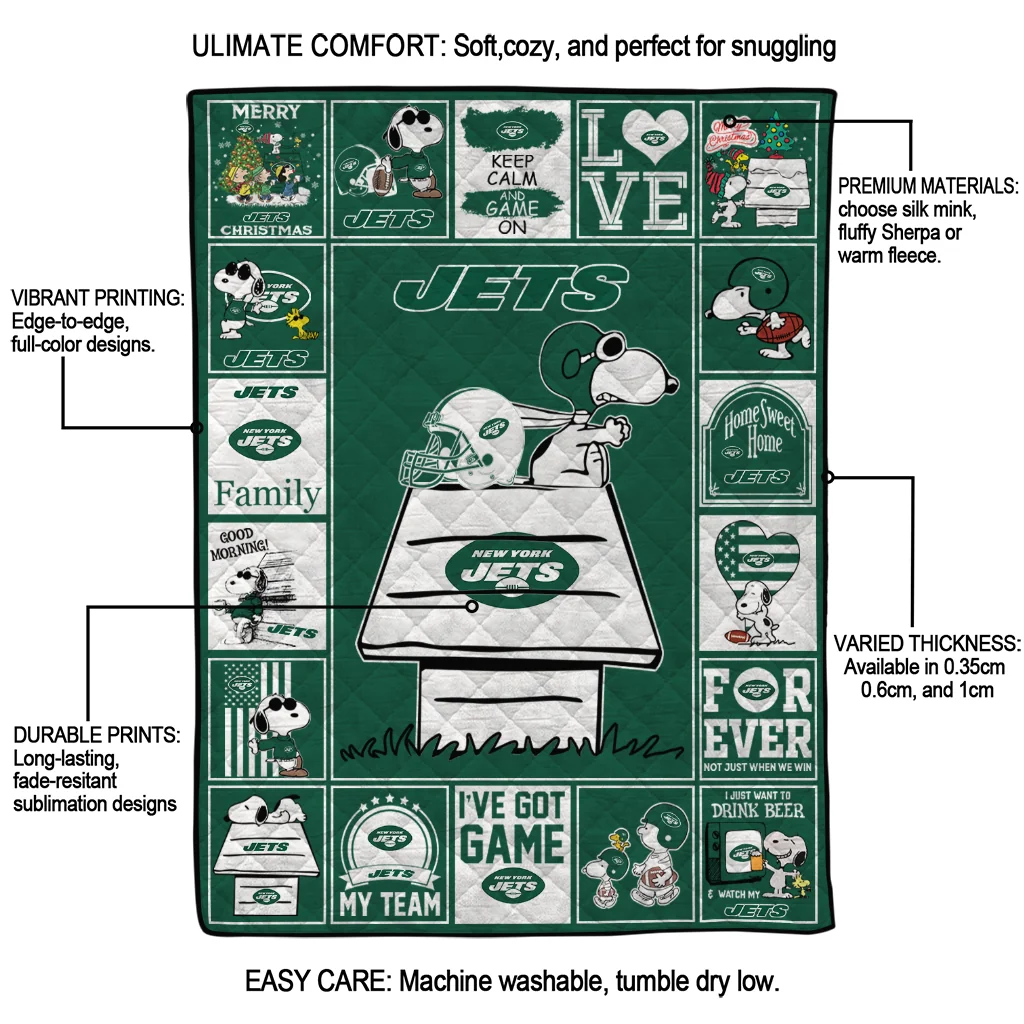 Wrap yourself in warmth and pride with the New York Jets Snoopy Love Green Quilt Blanket from the New York Jets Blankets collection at Yes That Blanket. Made from 100% premium quilting-weight polyester blended with a touch of microfiber, this quilt offers a smooth, soft finish you’ll love. Choose between two quilting styles—Stipple or Diagonal—and enjoy the comfort of a cotton-filled layer inside that adds extra coziness for every season. The border is available in classic black or white, giving your design a clean, timeless edge.