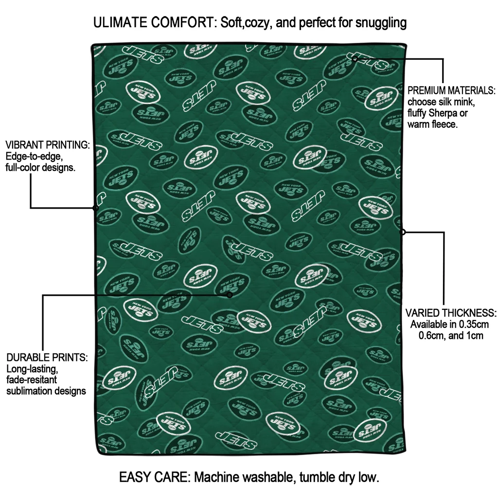 Wrap yourself in warmth and pride with the New York Jets Solid Classic Green Quilt Blanket from the New York Jets Blankets collection at Yes That Blanket. Made from 100% premium quilting-weight polyester blended with a touch of microfiber, this quilt offers a smooth, soft finish you’ll love. Choose between two quilting styles—Stipple or Diagonal—and enjoy the comfort of a cotton-filled layer inside that adds extra coziness for every season. The border is available in classic black or white, giving your design a clean, timeless edge.