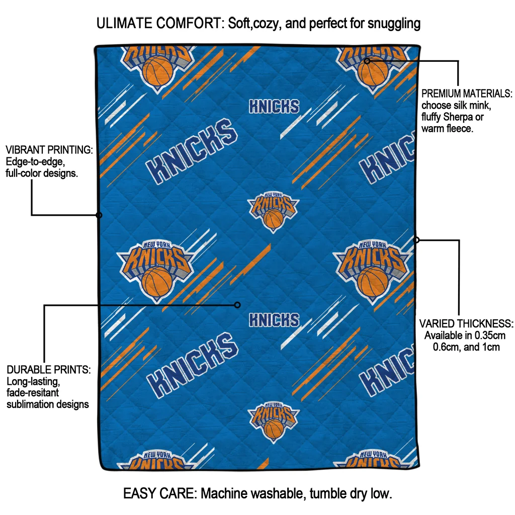 Wrap yourself in warmth and pride with the New York Knicks Sketch Lines Blue Quilt Blanket from the New York Knicks Blankets collection at Yes That Blanket. Made from 100% premium quilting-weight polyester blended with a touch of microfiber, this quilt offers a smooth, soft finish you’ll love. Choose between two quilting styles—Stipple or Diagonal—and enjoy the comfort of a cotton-filled layer inside that adds extra coziness for every season. The border is available in classic black or white, giving your design a clean, timeless edge.