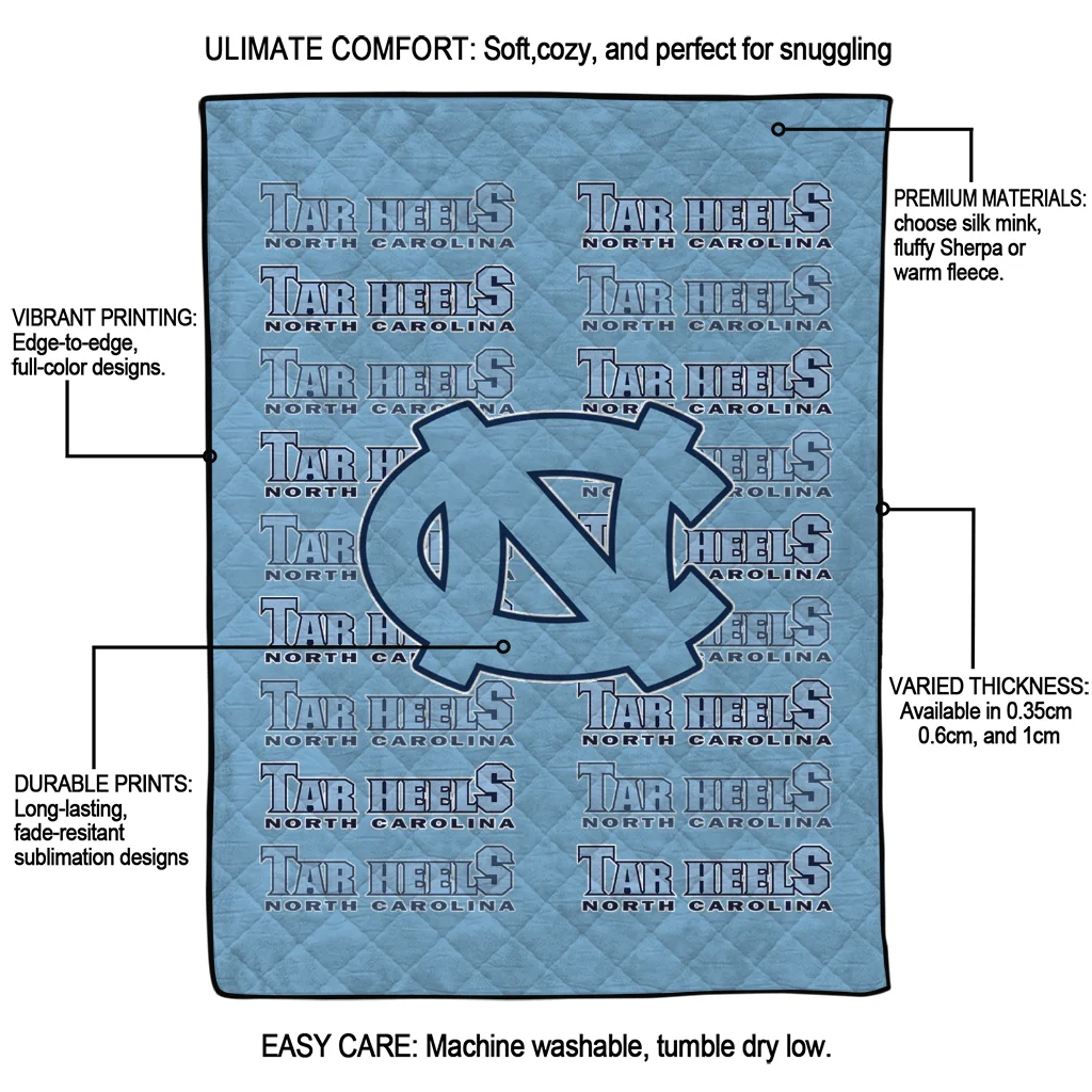 Wrap yourself in warmth and pride with the North Carolina Tar Heels Bold Red Light Blue Quilt Blanket from the North Carolina Tar Heels Blankets collection at Yes That Blanket. Made from 100% premium quilting-weight polyester blended with a touch of microfiber, this quilt offers a smooth, soft finish you’ll love. Choose between two quilting styles—Stipple or Diagonal—and enjoy the comfort of a cotton-filled layer inside that adds extra coziness for every season. The border is available in classic black or white, giving your design a clean, timeless edge.