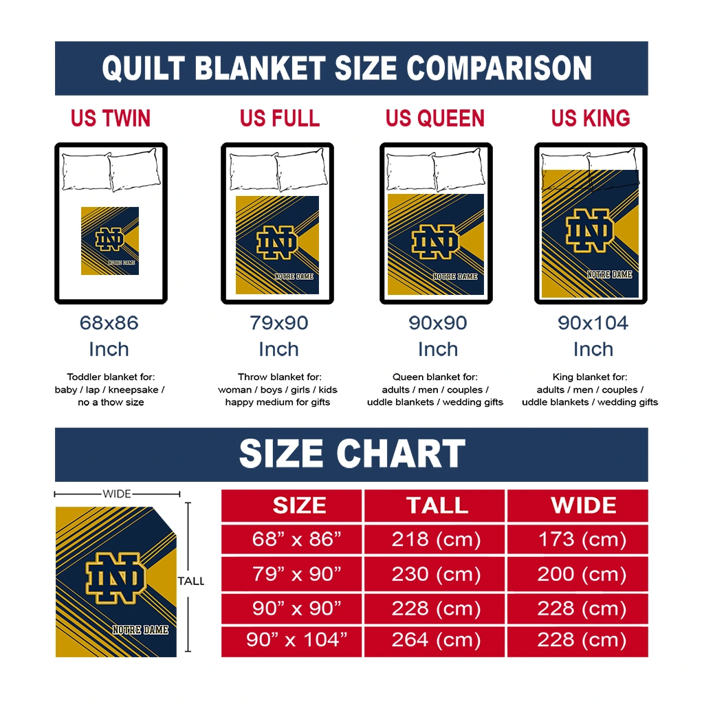 Wrap yourself in warmth and pride with the Notre Dame Fighting Irish Arrow Layers Navy Quilt Blanket from the Notre Dame Fighting Irish Blankets collection at Yes That Blanket. Made from 100% premium quilting-weight polyester blended with a touch of microfiber, this quilt offers a smooth, soft finish you’ll love. Choose between two quilting styles—Stipple or Diagonal—and enjoy the comfort of a cotton-filled layer inside that adds extra coziness for every season. The border is available in classic black or white, giving your design a clean, timeless edge.