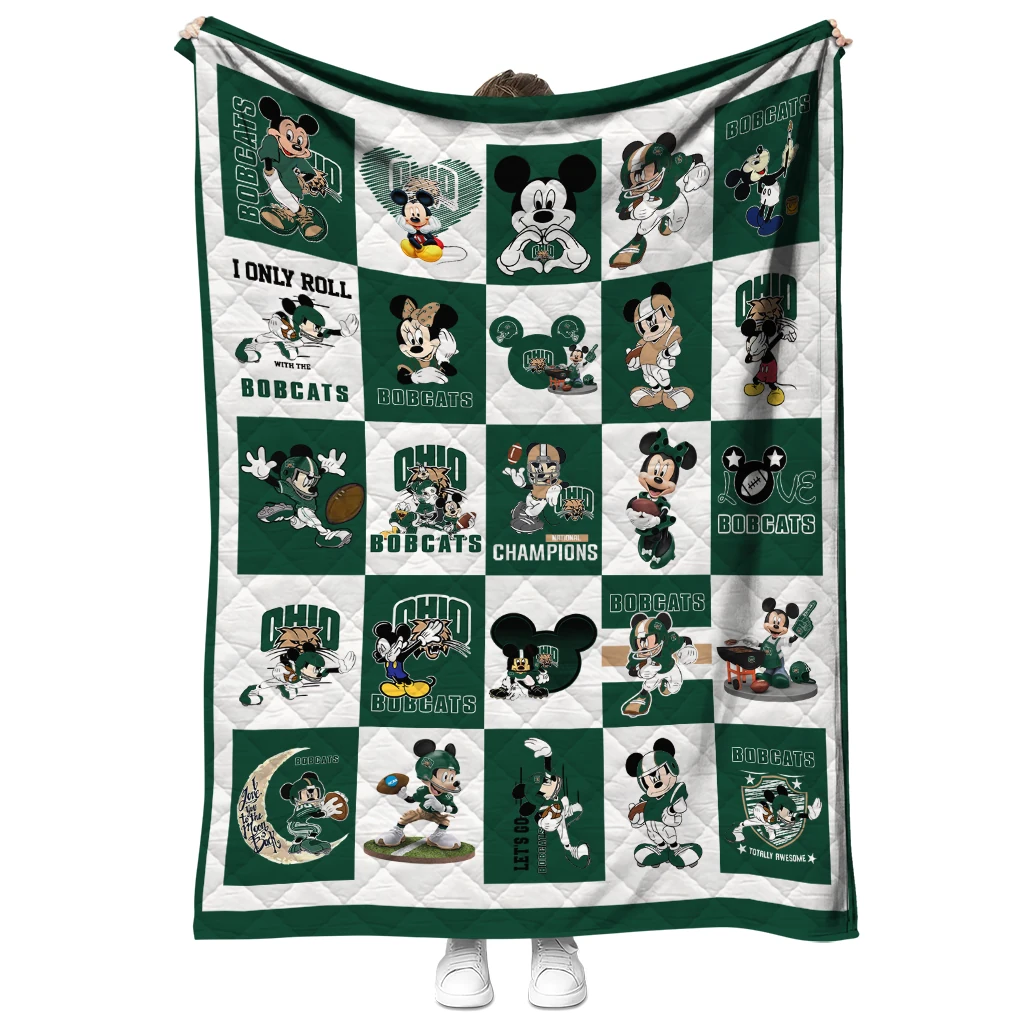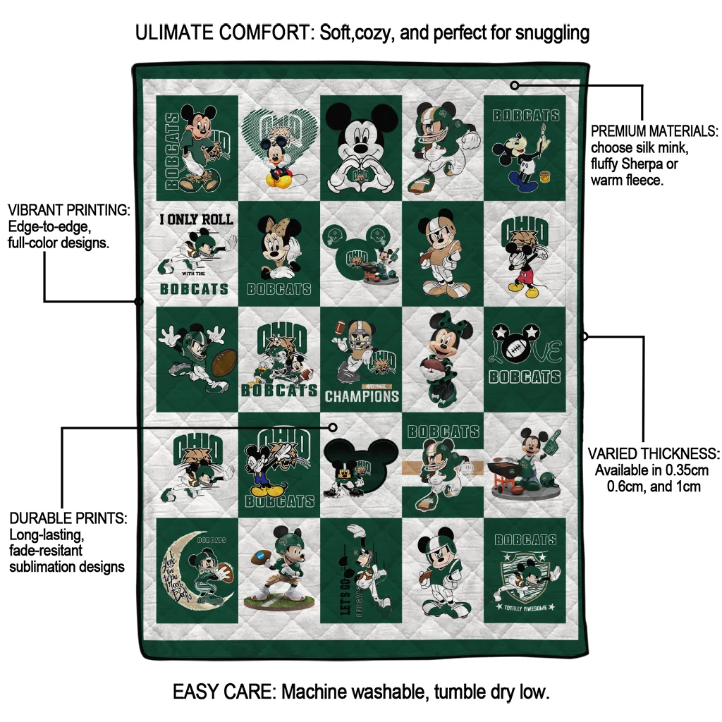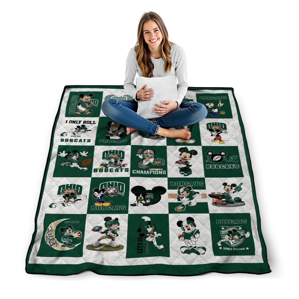 The Ohio Bobcats Mickey Mouse Motif Green White Quilt Blanket is more than a blanket—it’s everyday comfort, thoughtfully made. Crafted from premium quilting fabric with a soft microfiber touch, it offers a smooth hand-feel and lasting coziness. Layered quilting with a cotton-filled core provides adaptable warmth across seasons while maintaining a clean, tailored look on your bed or sofa.