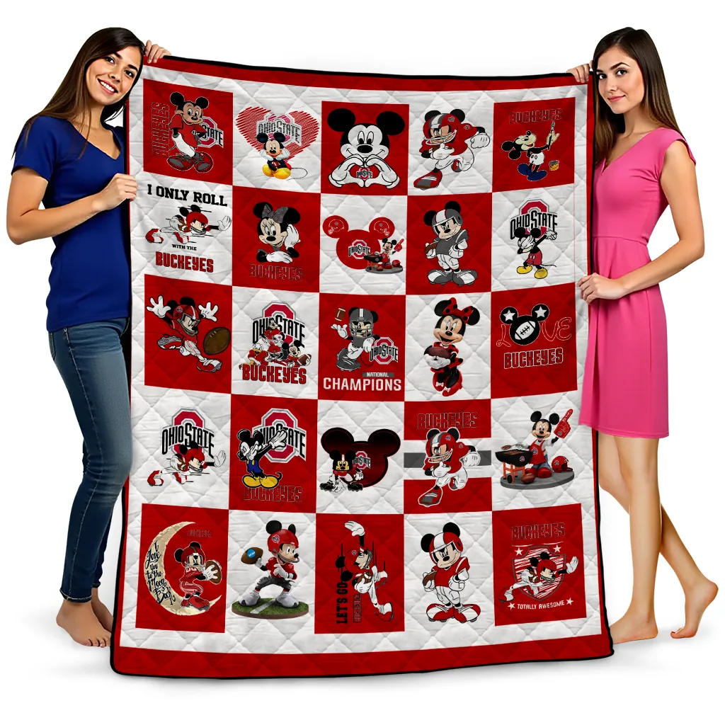 Wrap yourself in warmth and pride with the Ohio State Buckeyes Mickey Mouse Motif Scarlet White Quilt Blanket from the Ohio State Buckeyes Blankets collection at Yes That Blanket. Made from 100% premium quilting-weight polyester blended with a touch of microfiber, this quilt offers a smooth, soft finish you’ll love. Choose between two quilting styles—Stipple or Diagonal—and enjoy the comfort of a cotton-filled layer inside that adds extra coziness for every season. The border is available in classic black or white, giving your design a clean, timeless edge.
