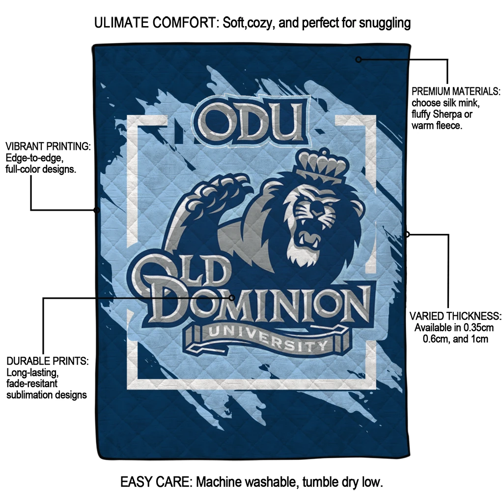 Wrap yourself in warmth and pride with the Old Dominion Monarchs Block Border Blue Quilt Blanket from the Old Dominion Monarchs Blankets collection at Yes That Blanket. Made from 100% premium quilting-weight polyester blended with a touch of microfiber, this quilt offers a smooth, soft finish you’ll love. Choose between two quilting styles—Stipple or Diagonal—and enjoy the comfort of a cotton-filled layer inside that adds extra coziness for every season. The border is available in classic black or white, giving your design a clean, timeless edge.